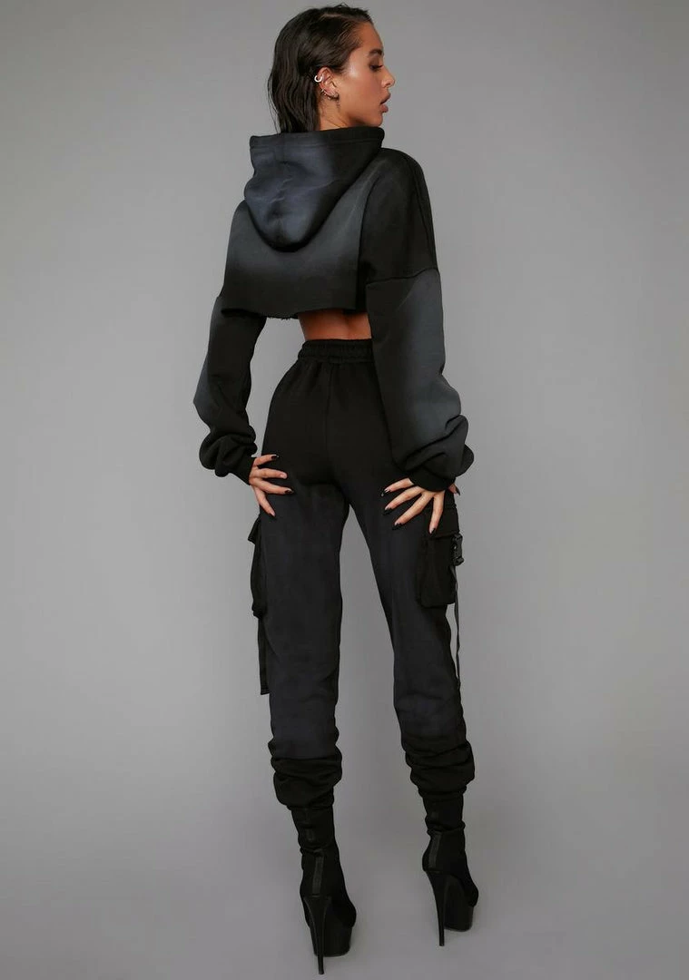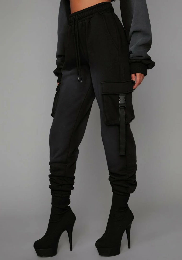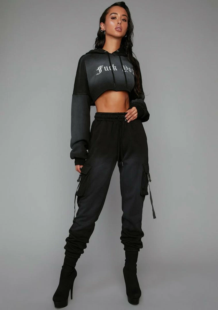 cuz I do what I want, when I want. These DGAF jogger pants appear more faded in person and have a fleece construction, a high drawstring waistband, and cargo pockets with snap buckle closures.