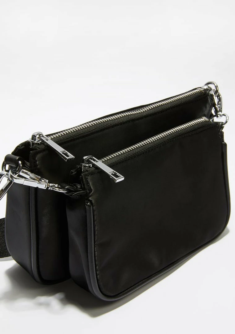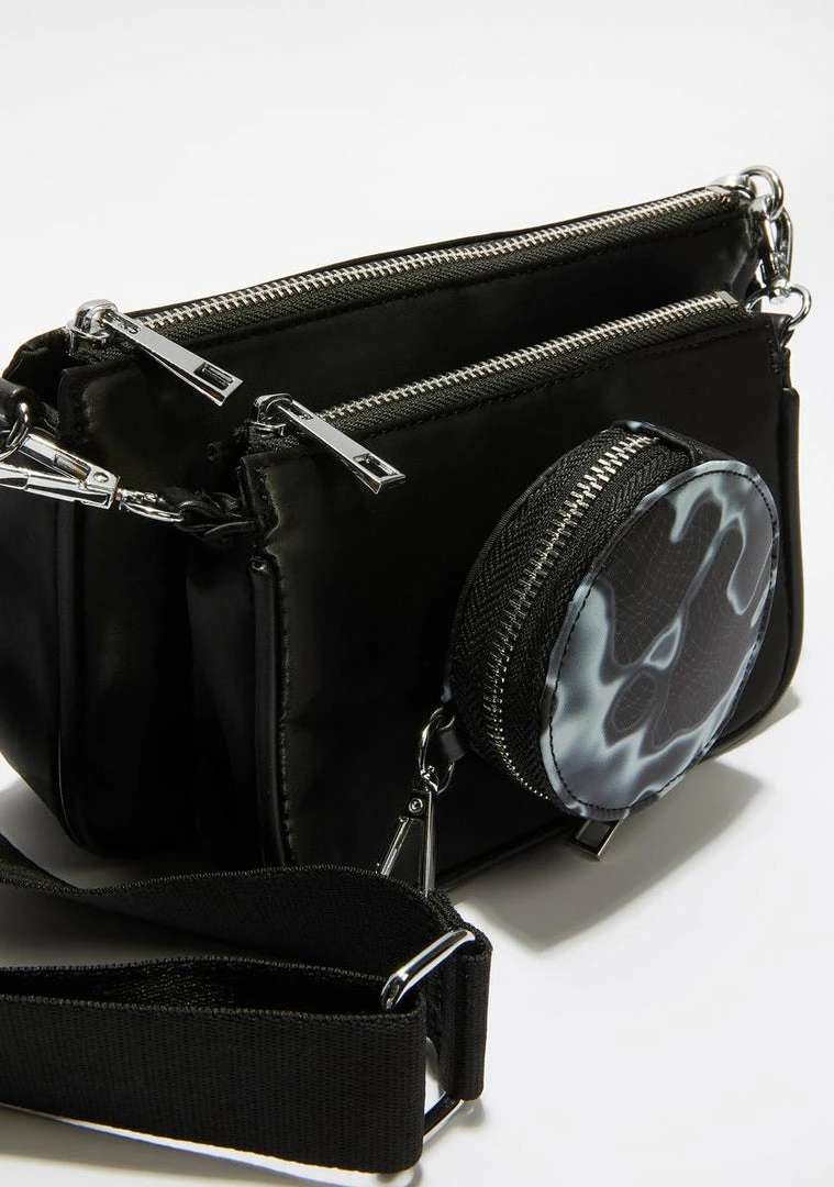 and itâs not even a competition for you. This crossbody bag set has an adjustable nylon strap with a grid-pattern circle pouch and curved boxy pouch clipped onto it.