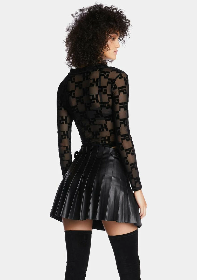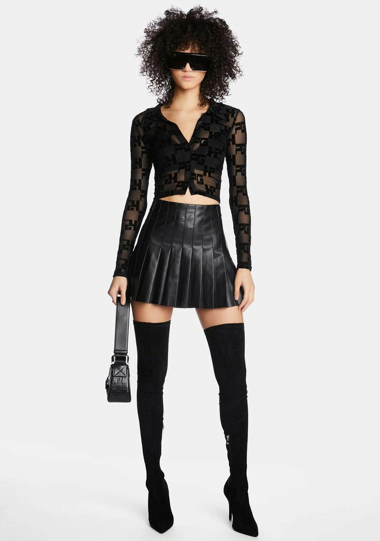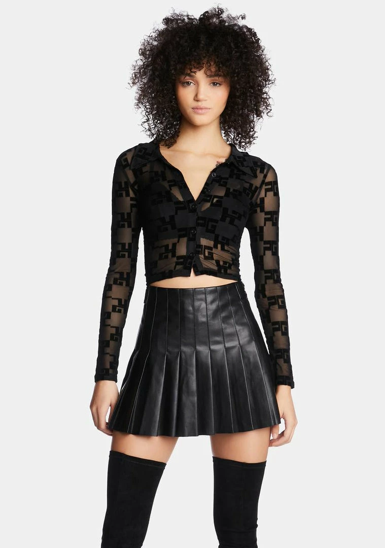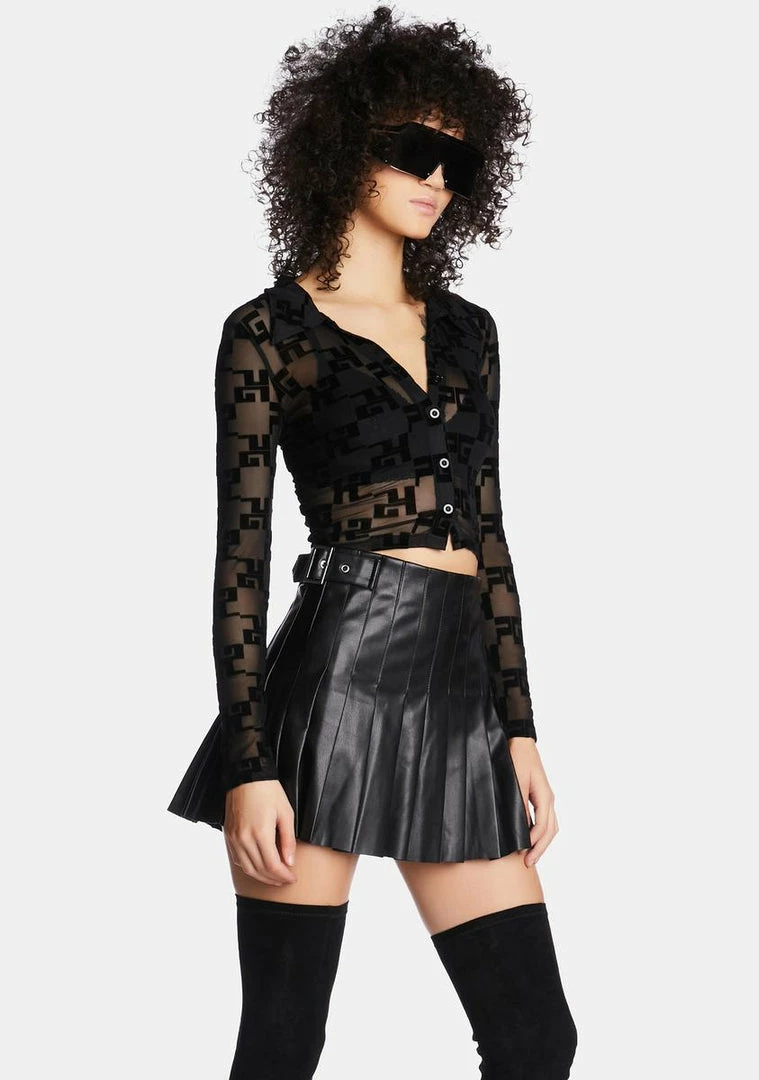 leave the games behind. This cropped shirt has a stretchy sheer mesh construction, a burnout velvet branded pattern all over, a collared neckline, front button closures, and long sleeves.