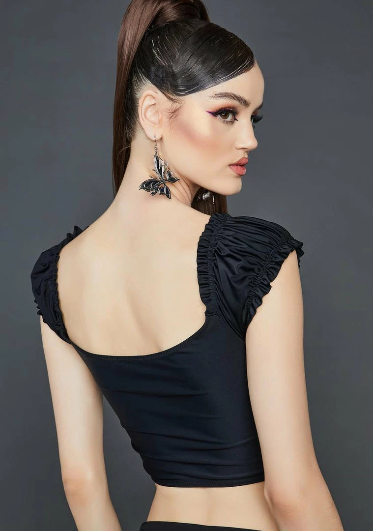 cuz we have a problem. Solve it in this cropped top that features cutouts at front with O-ring hardware, puffed cap sleeves, and a stretchy fabrication with a hint of sheen.