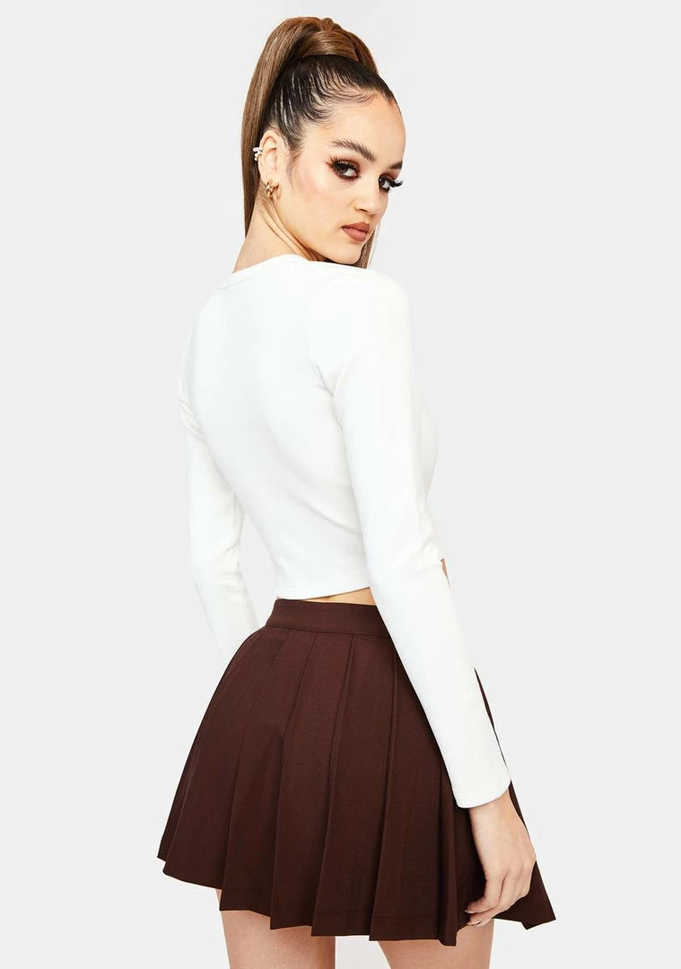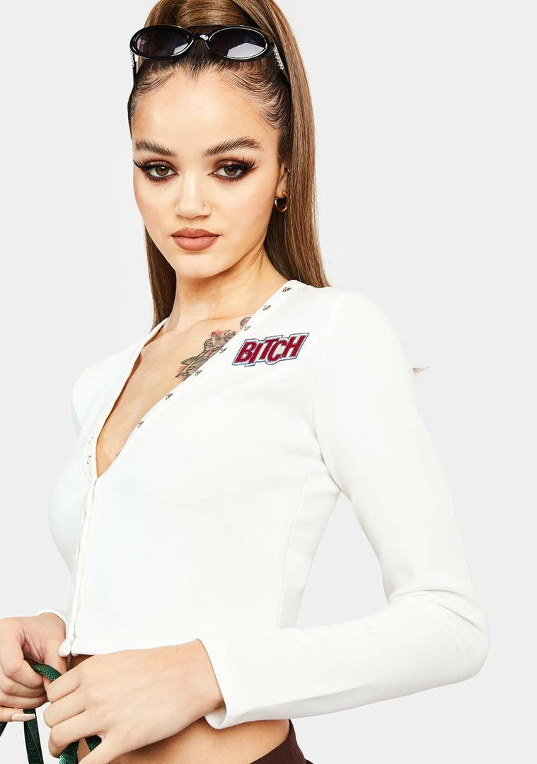 cuz youâre too good at being bad. This long sleeve crop tee has a V-neckline, lots of button closures for adjustable front coverage, and an embroidered âbitchâ patch on the front.