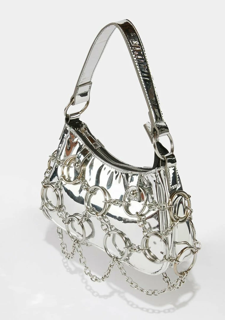 before you wreck yourself. This shoulder bag has a reflective silver exterior with a chain link O-ring design and a top zipper closure.