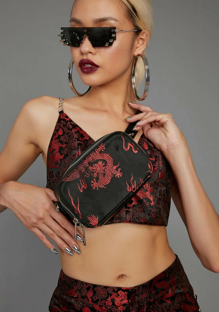 cuz youâre ready for anything. Maximize your exposure with this belt bag that has a brocade dragon print with a zipper closure.