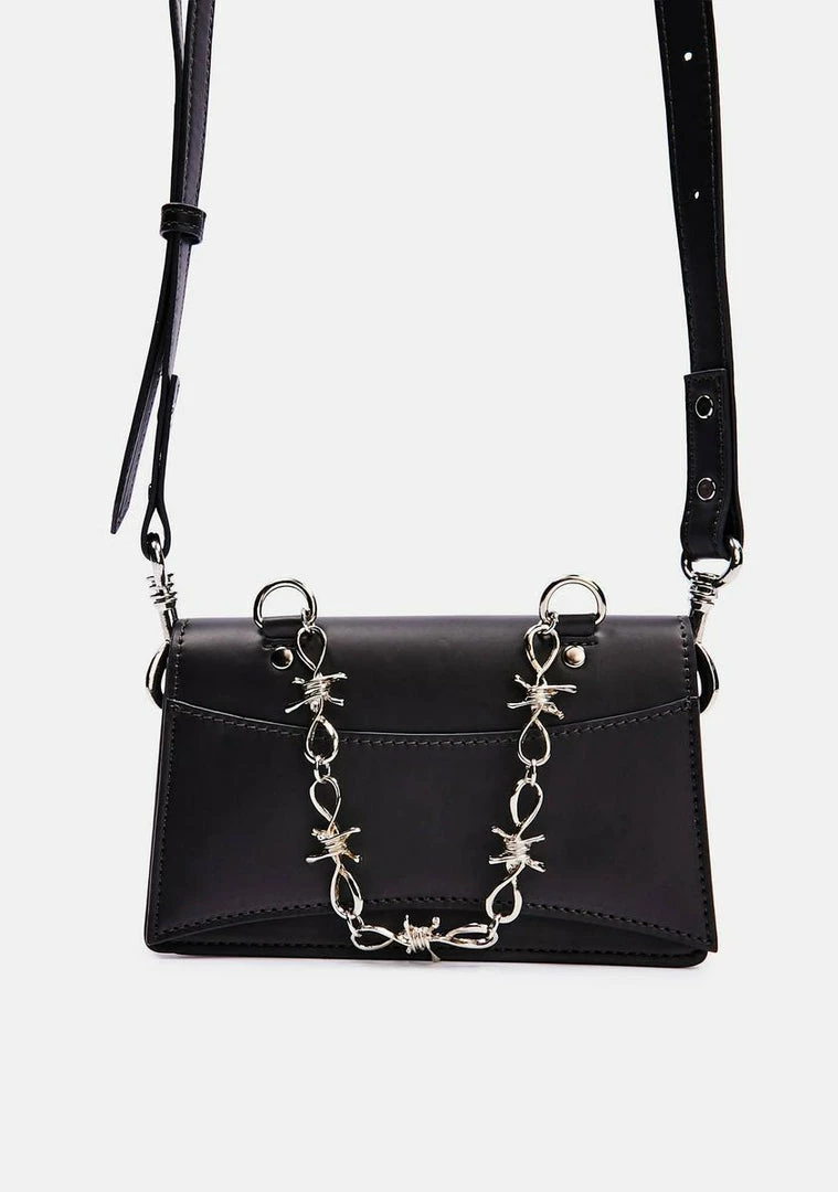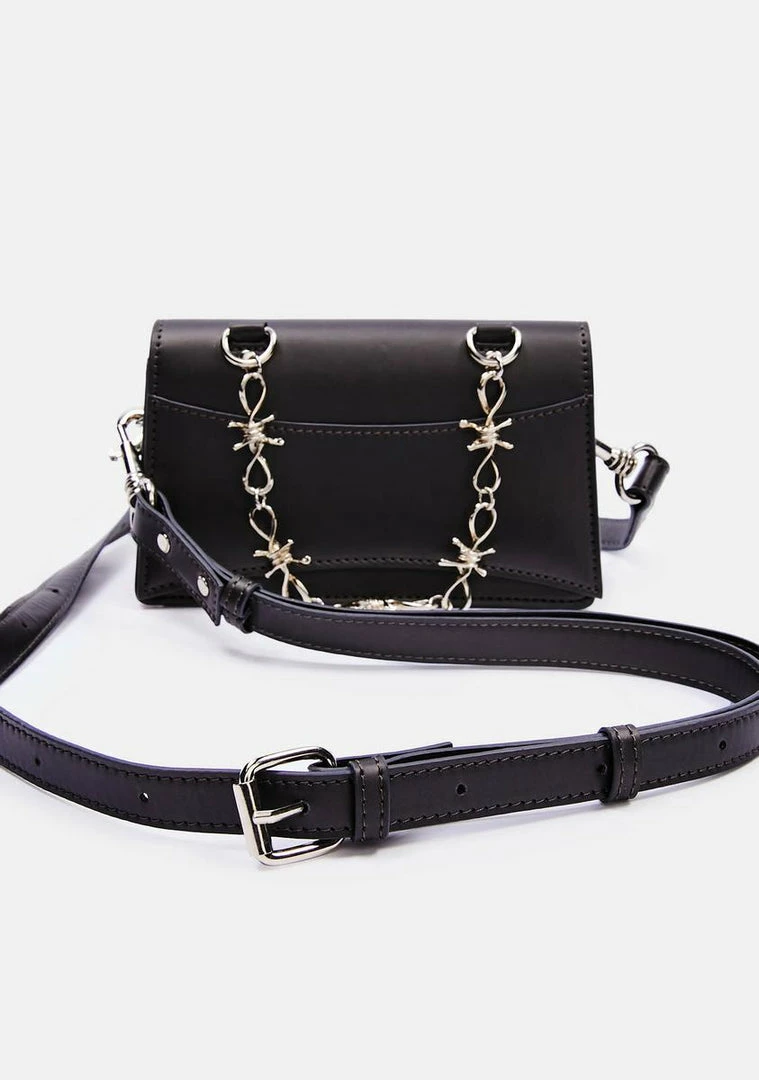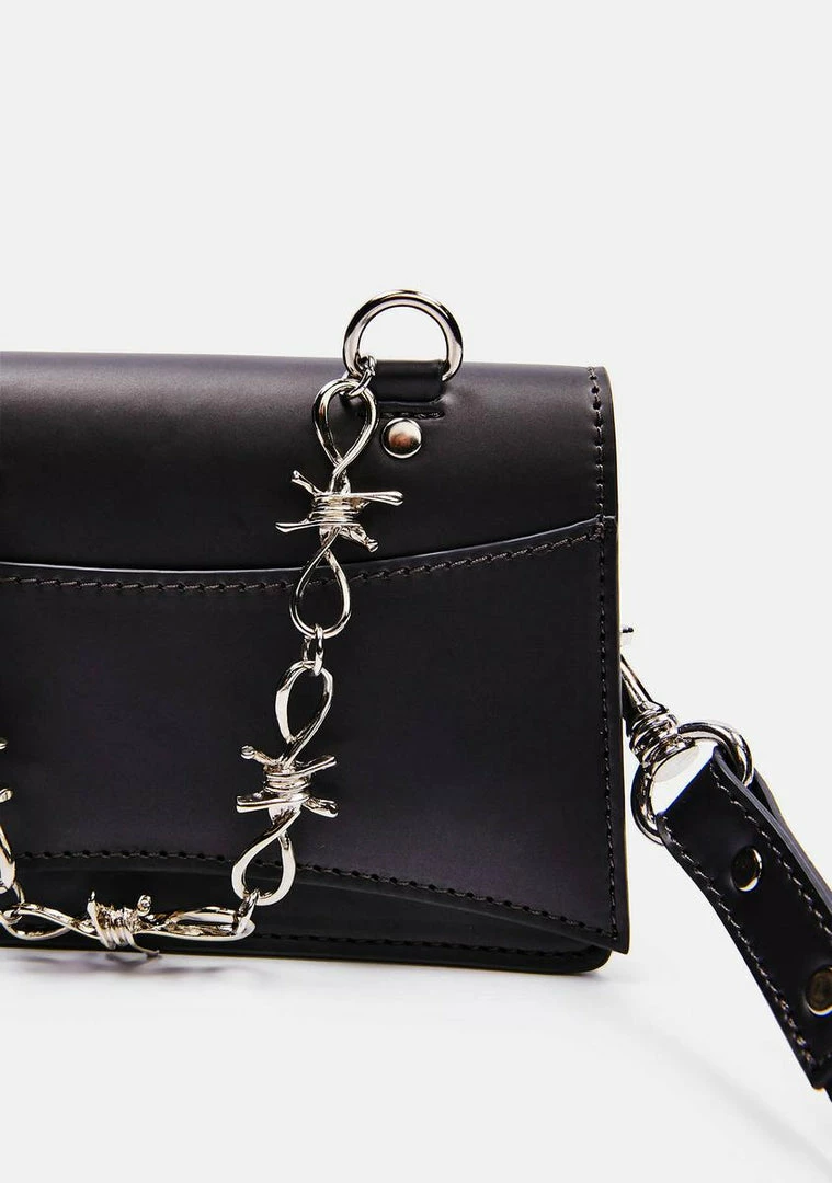 but you wanna guard your heart. This faux leather mini belt bag has a fold over top, D-ring hardware, barbed wire chain details, and an adjustable waist strap.