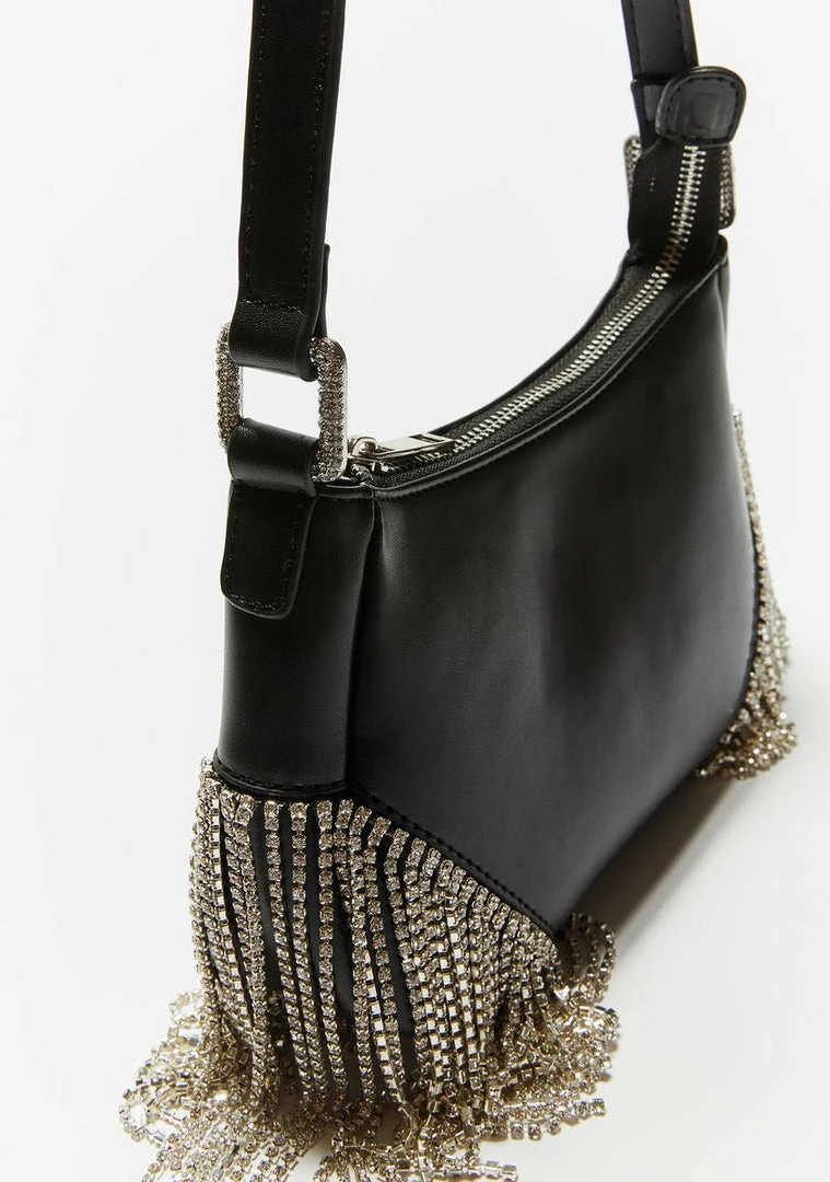 cuz the only sign u need is a dolla sign, bb! Itz all about the benjamins with this money makin baguette shoulder bag that has a smooth vegan leather construction, blinginâ rhinestone fringe, and a top zip closure.