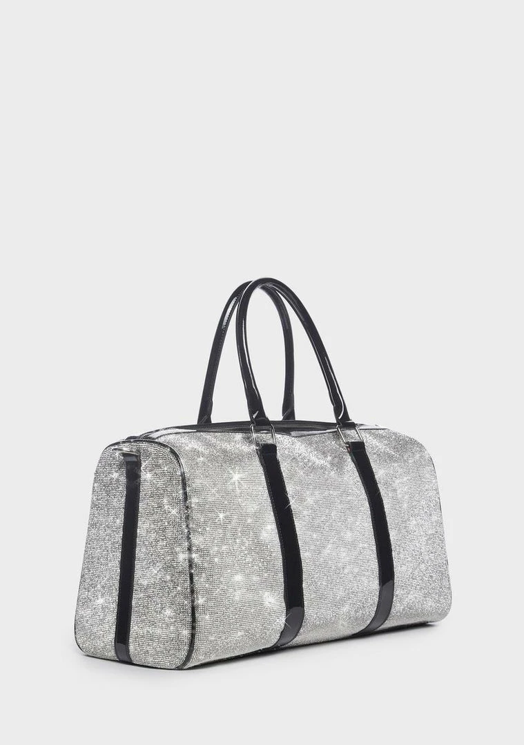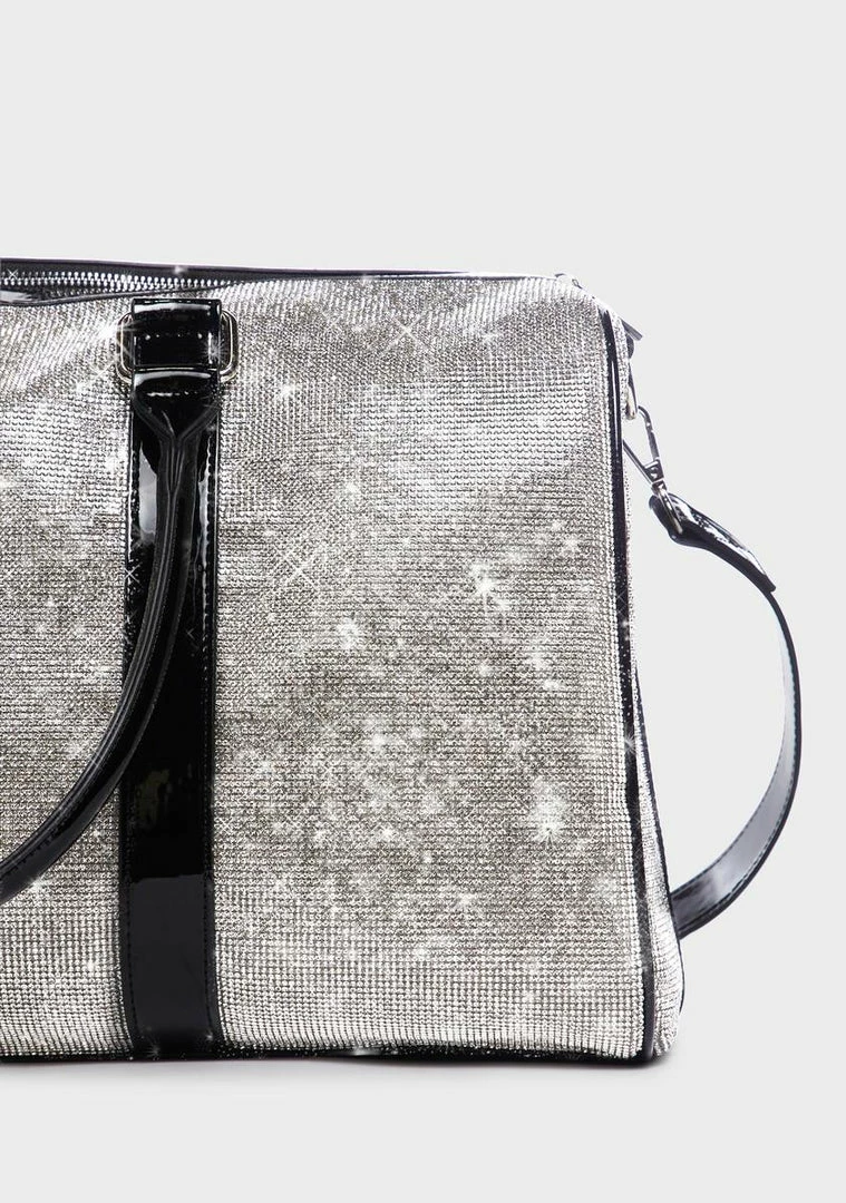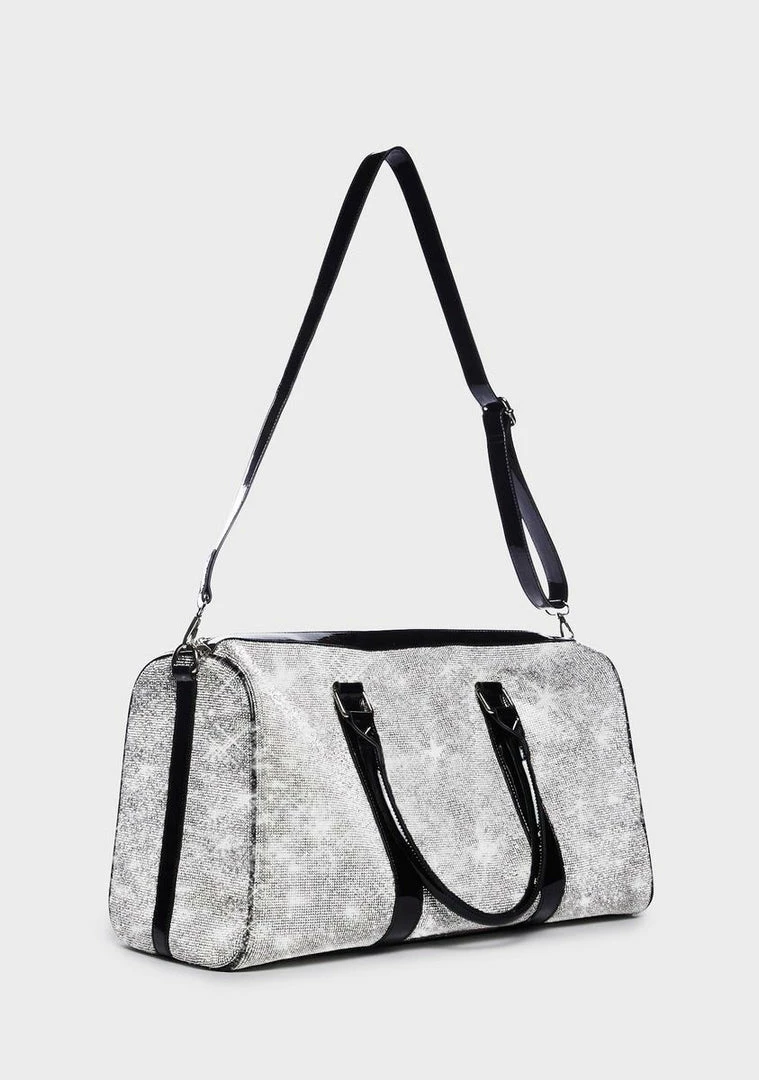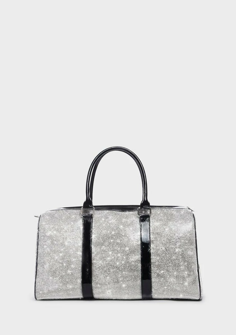 cuz luxury never goes out of style. This weekender bag has sparkly rhinestones all over, patent vegan leather double top handles, a top zip closure, and comes with a detachable and adjustable shoulder strap.