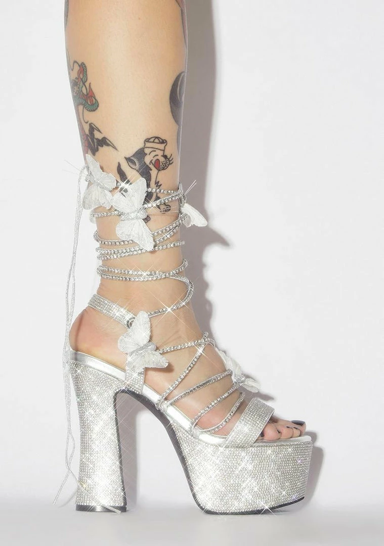 cuz itz icy SZN, bae! Be a rare vision of pricey perfection in these supa sexy platform heels that have lil rhinestone 3D butterflies all ova, chunky heels N’ shimmerin’ lace-up self-tie closures.