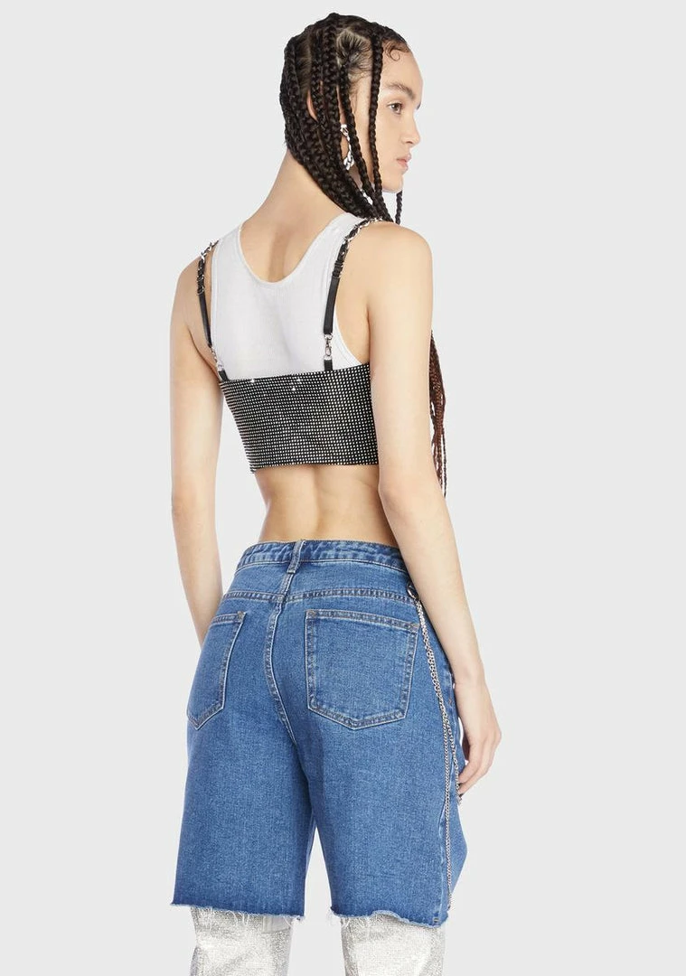 new wrist, new whip, ride around dipped! Have ’em doin’ a double take in this forever icy corset top that has sparkling rhinestones all over, detachable braided chain shoulder straps, and a front zip closure.