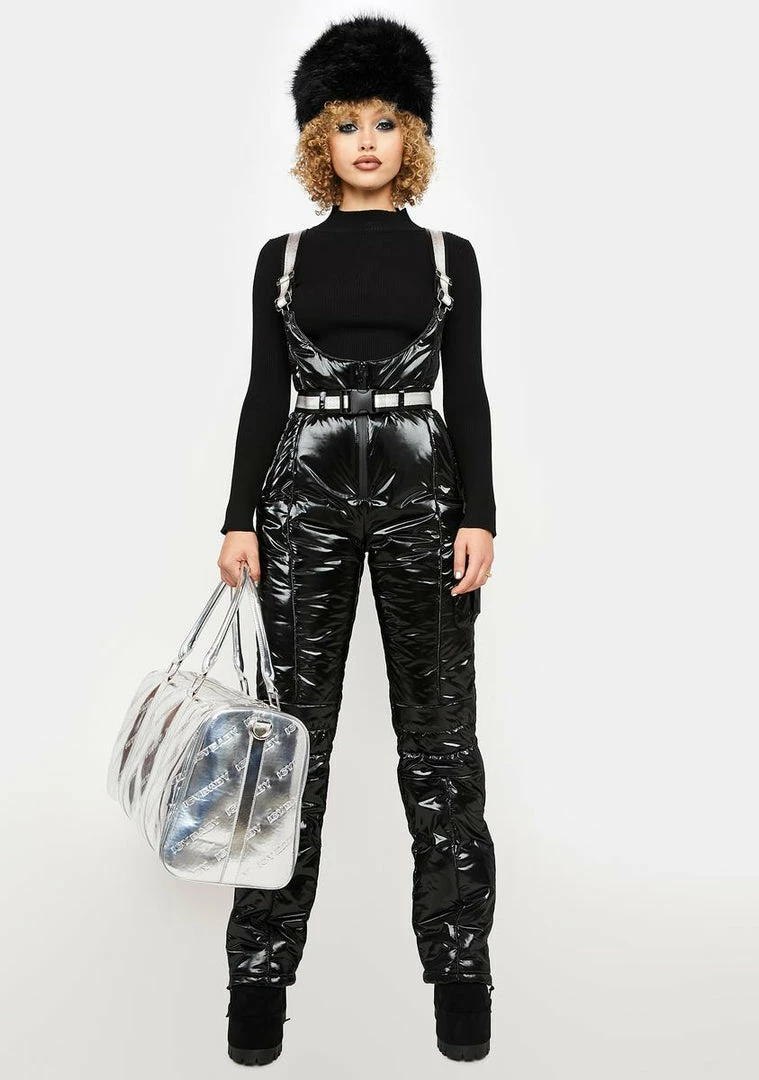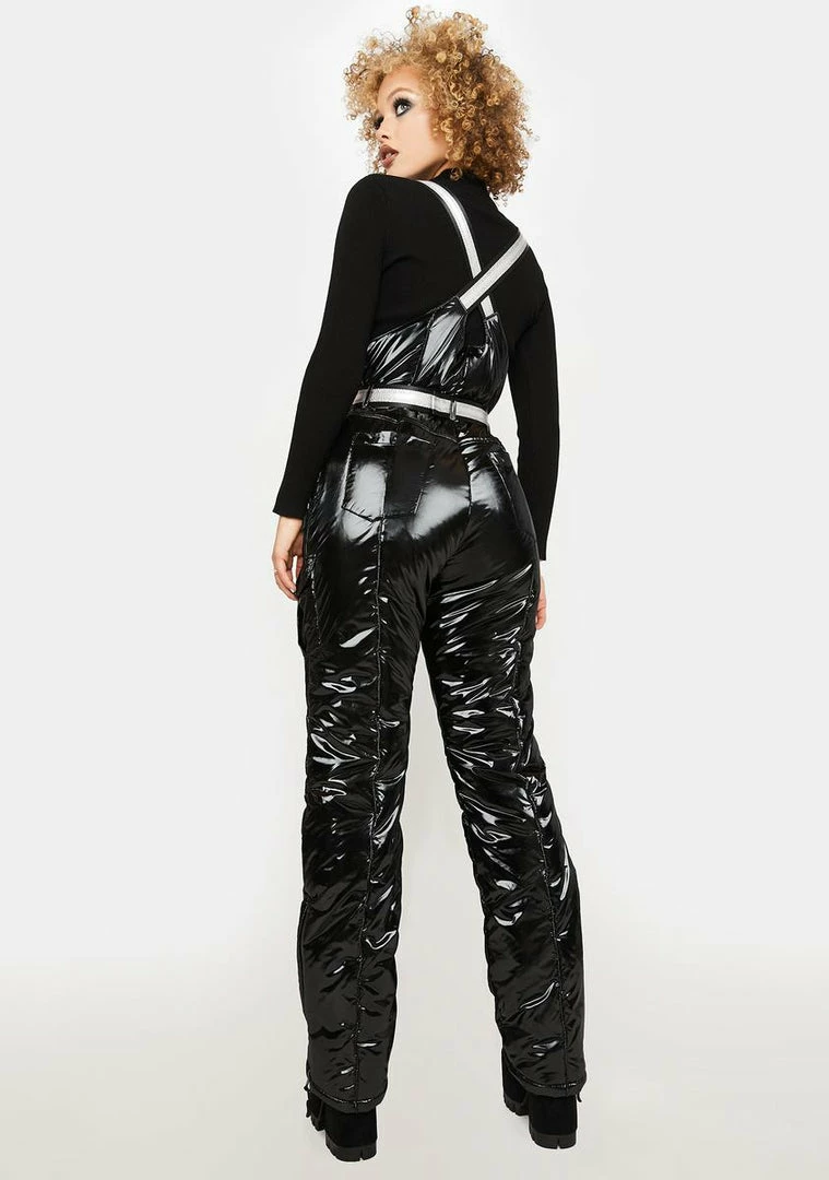 not even a snow storm can slow you down. These snowsuit overalls have a puffy vinyl design with ruching details, a neckline below the bust, a front zip closure, and reflective straps.