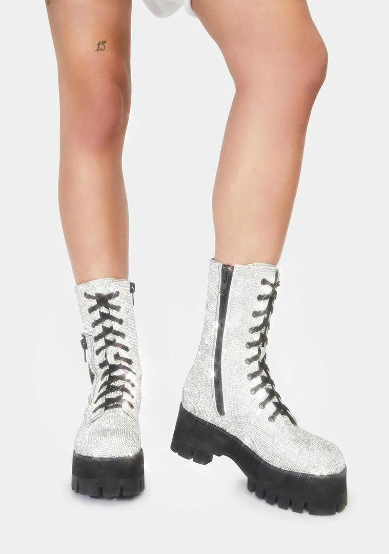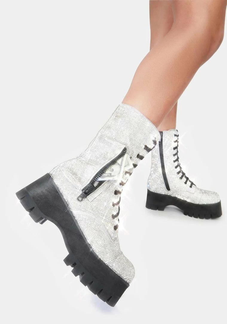 cuz youâre an iced out empress! These sparkling rhinestone combat boots have chunky platform soles, side zip closures, adjustable lace-ups, and side zip pockets to stash your secrets.