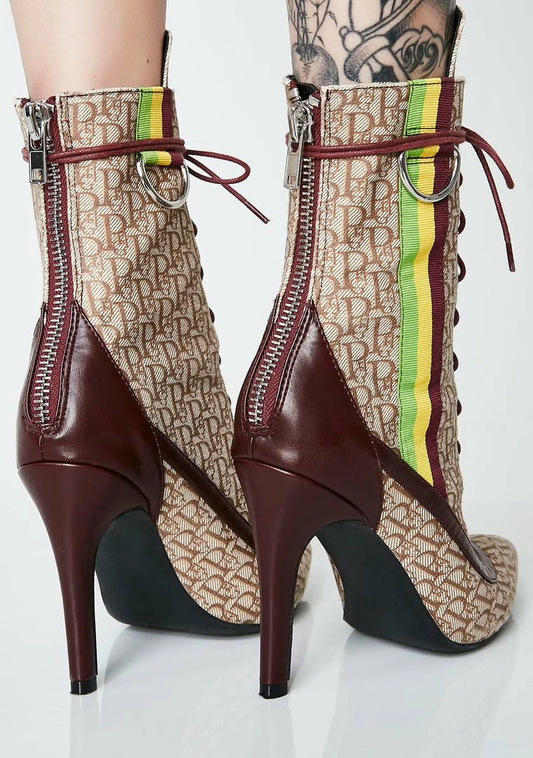 cuz ya tiptoe any Nâ everywhere. Try to keep it PG in these ca$h schmoney booties that have a PG logo print all ova, pointed toes, a multitone side stripe detail with D ring, and a lace-up Nâ zip closure to have ya feet on fleek all night bb.