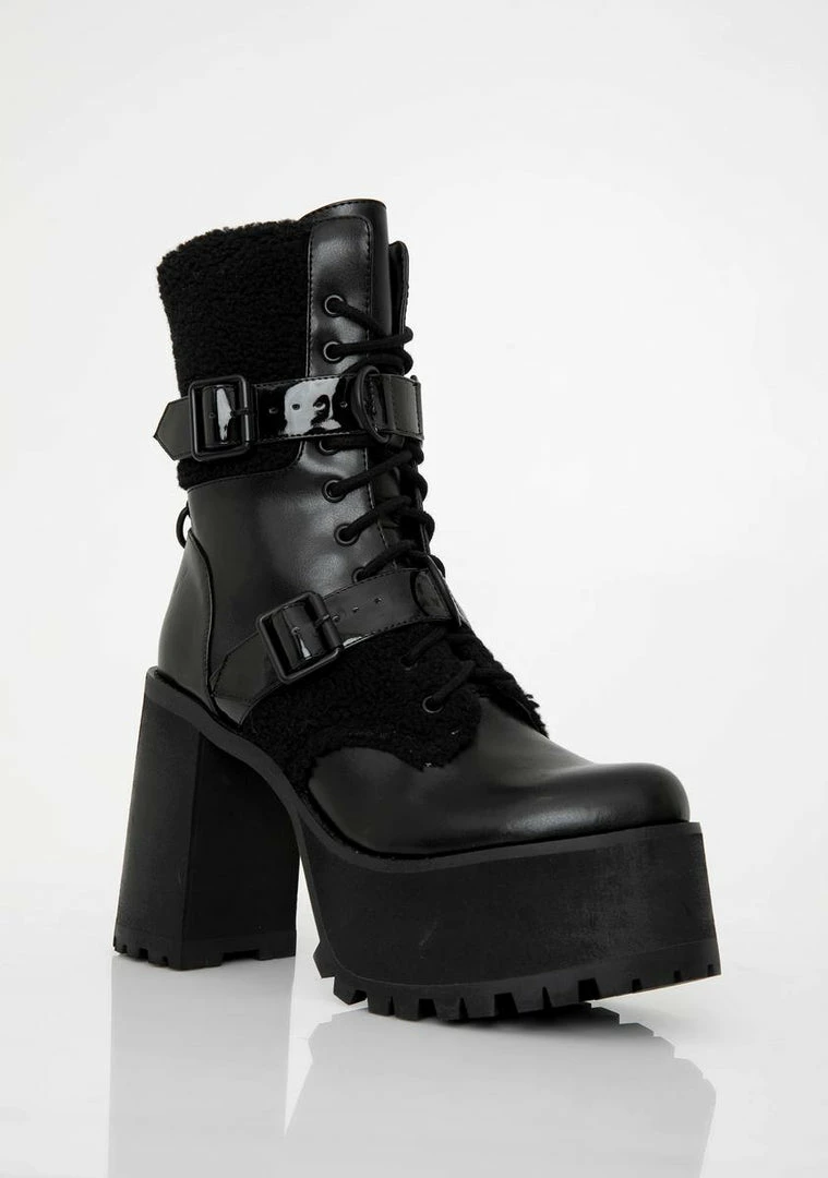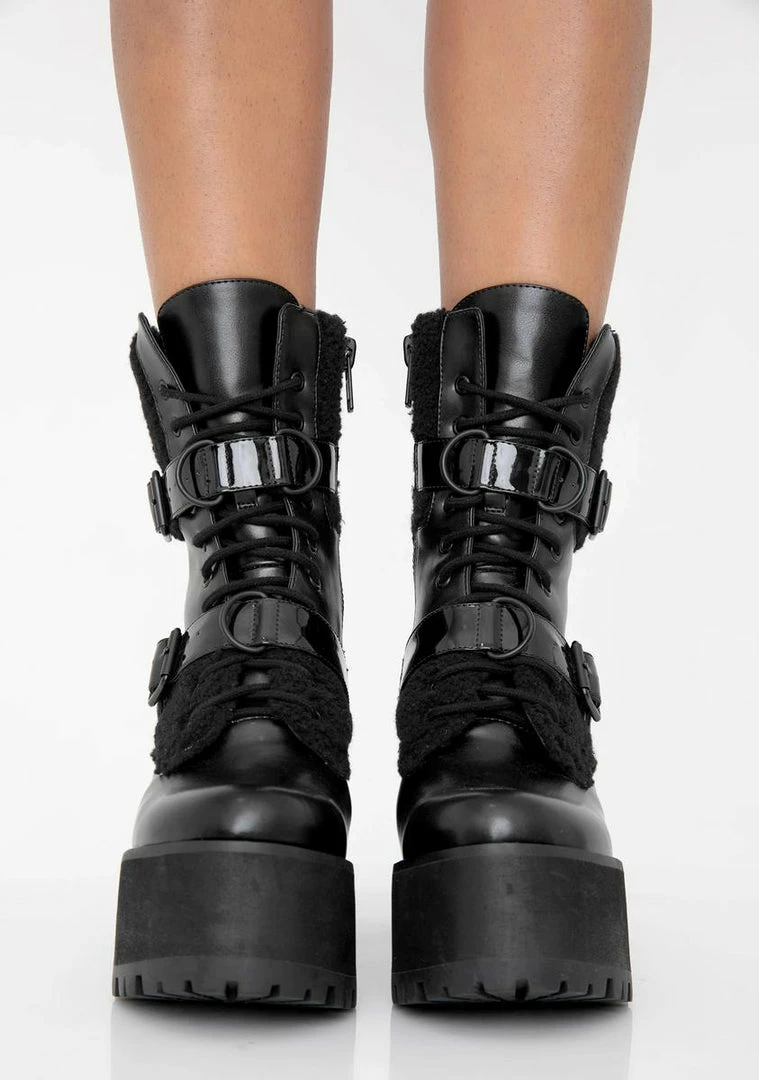 have âem spending all their dough on you. Youâre everybody’s type in these ankle boots that have faux fur trimmings, lace up Nâ vinyl buckle closures and chunky treaded soles.