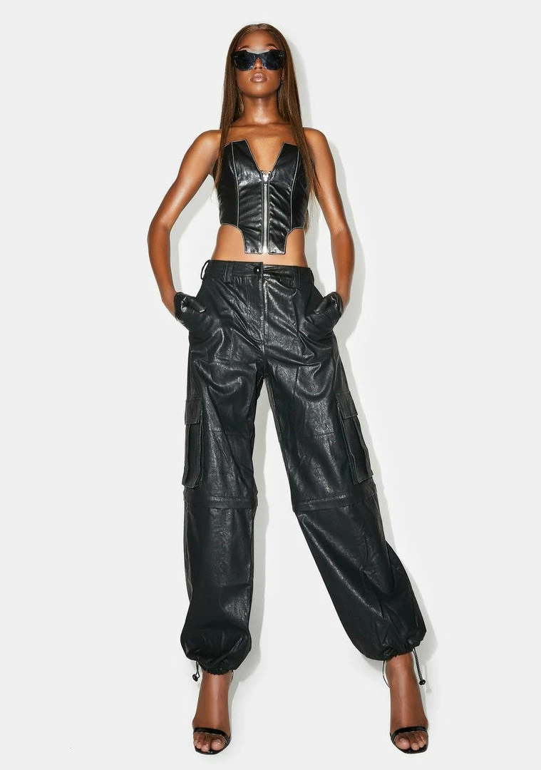 cuz you werk hard & play harder! All you do is win in these boss bish convertible parachute pants that have a vegan leather construction, hi rise fit, cargo pockets, button zip closures and can be zipped off into sikk shorts.