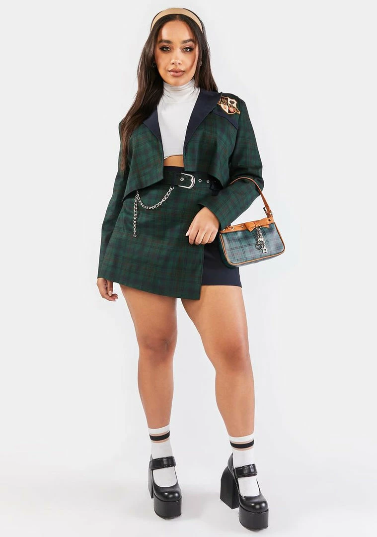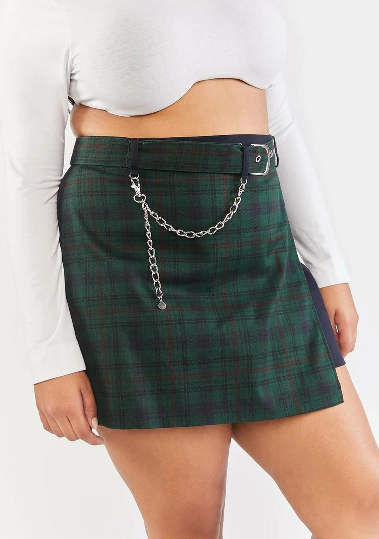 cuz ur anything but ordinary. This mini skirt has a high rise belted waist, a wraparound design, a plaid pattern all over, and a metallic chain detail.
