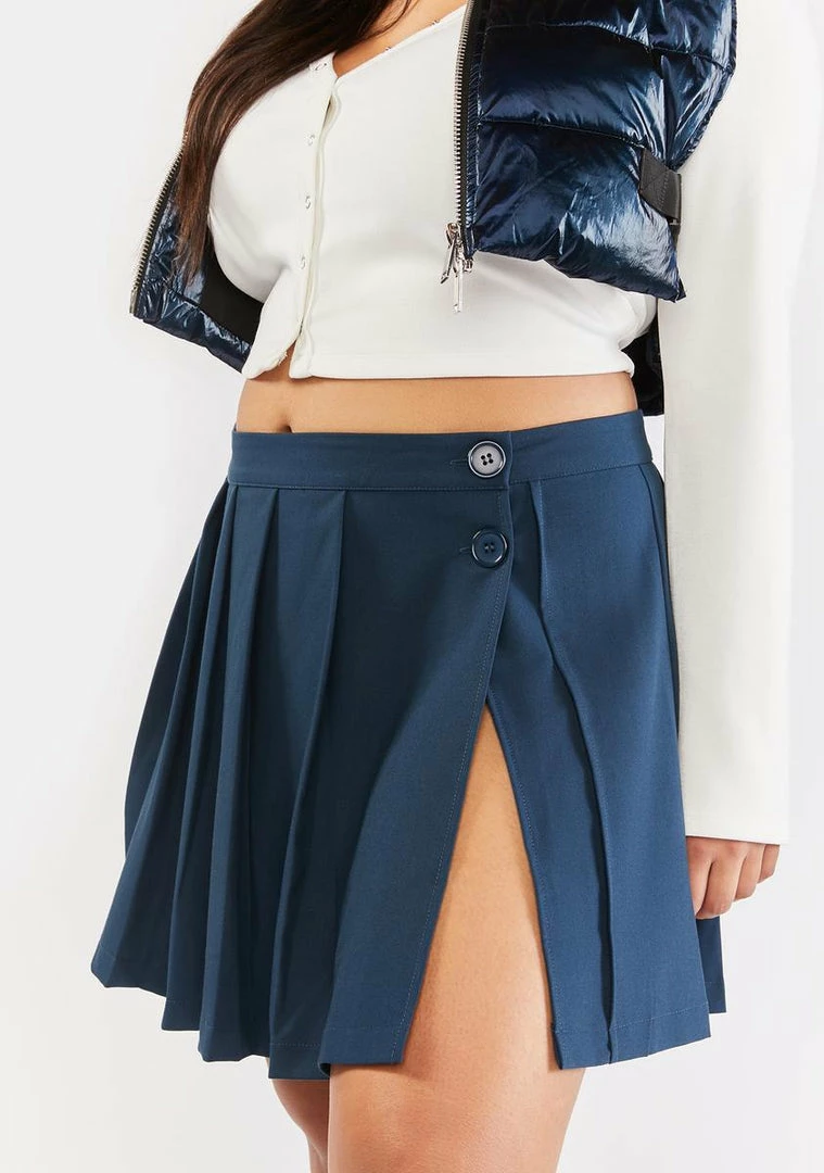 cuz there’s no use making quick decisions! This pleated mini skirt has a high-rise waist, a wrap-style design, two button closures, and a side split hem.