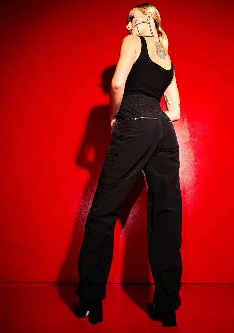 cuz you do what you want when you wanna! These nylon jogger pants feature a high rise waistline, slits up the legs, cargo pockets, and zipper details all over.