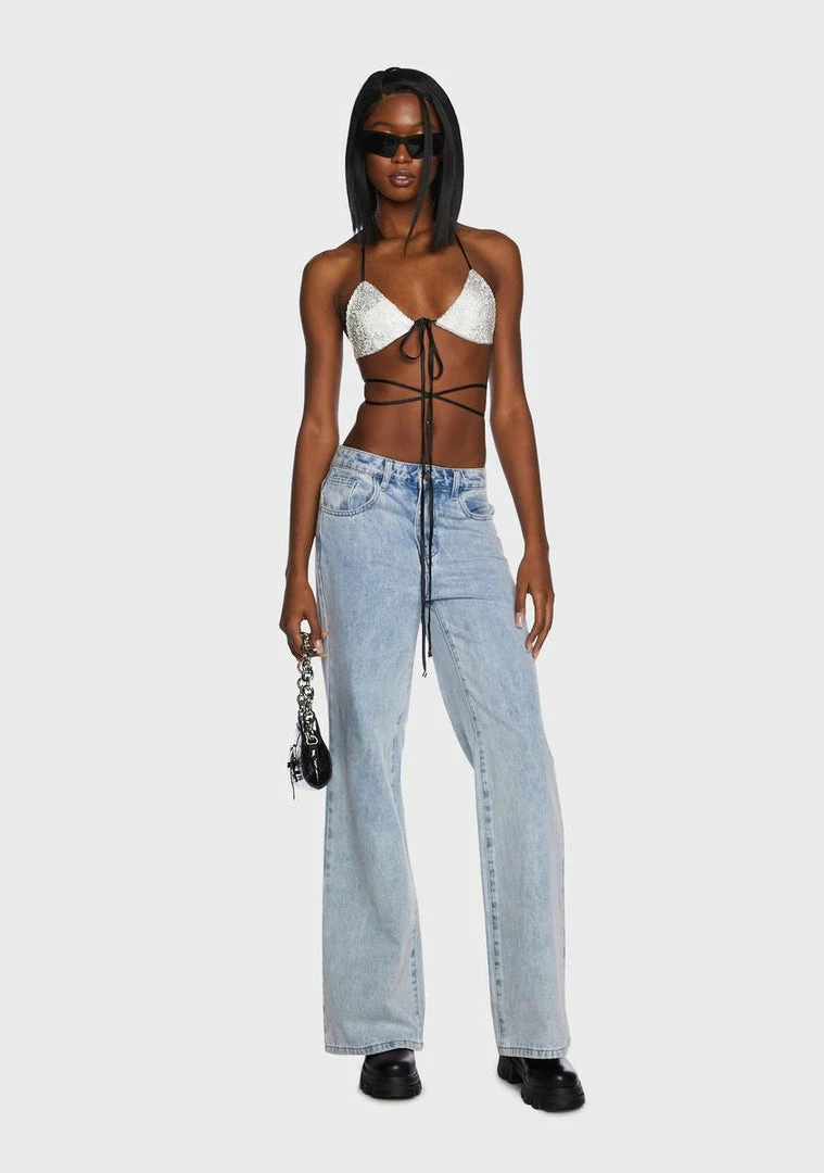 cuz you don’t care if they’re hating, you get that money regardless! This wrap bra top has rhinestone studded cups, an adjustable strappy design, and a soft satin lining.