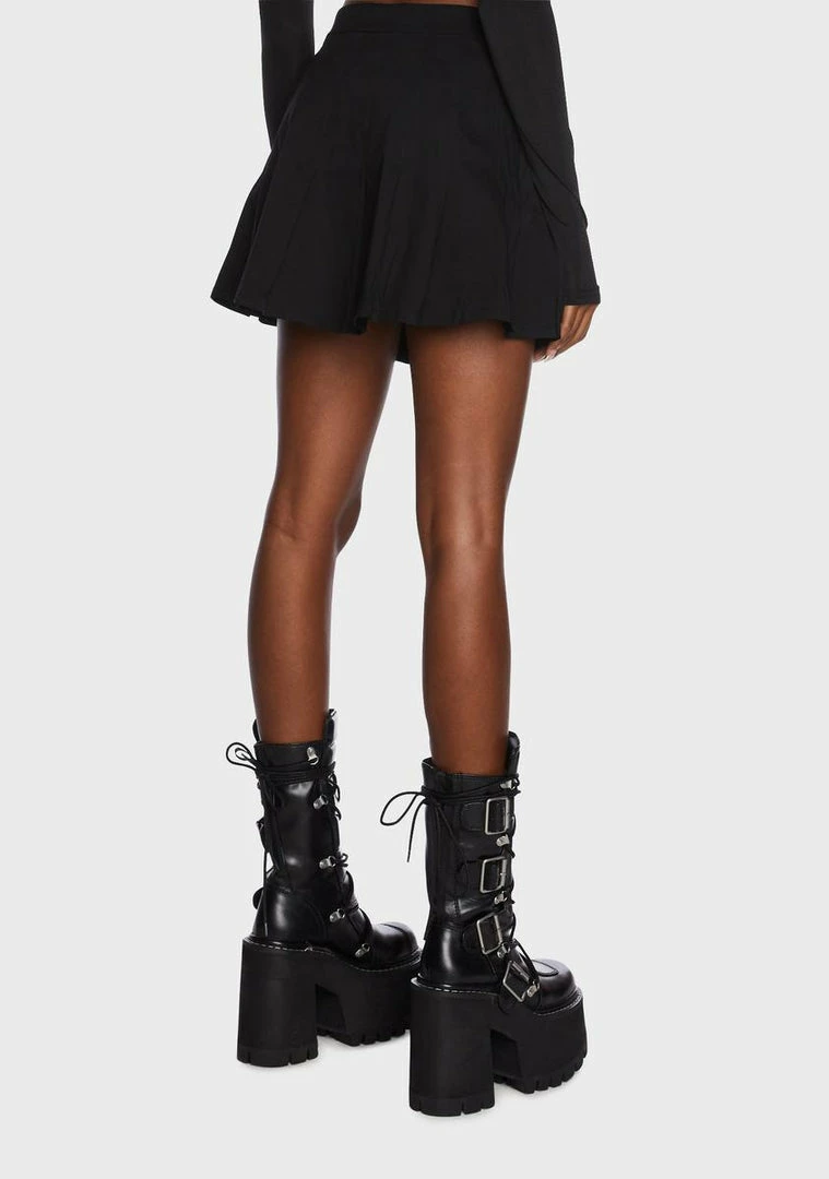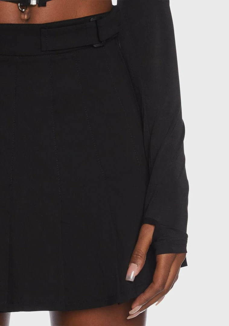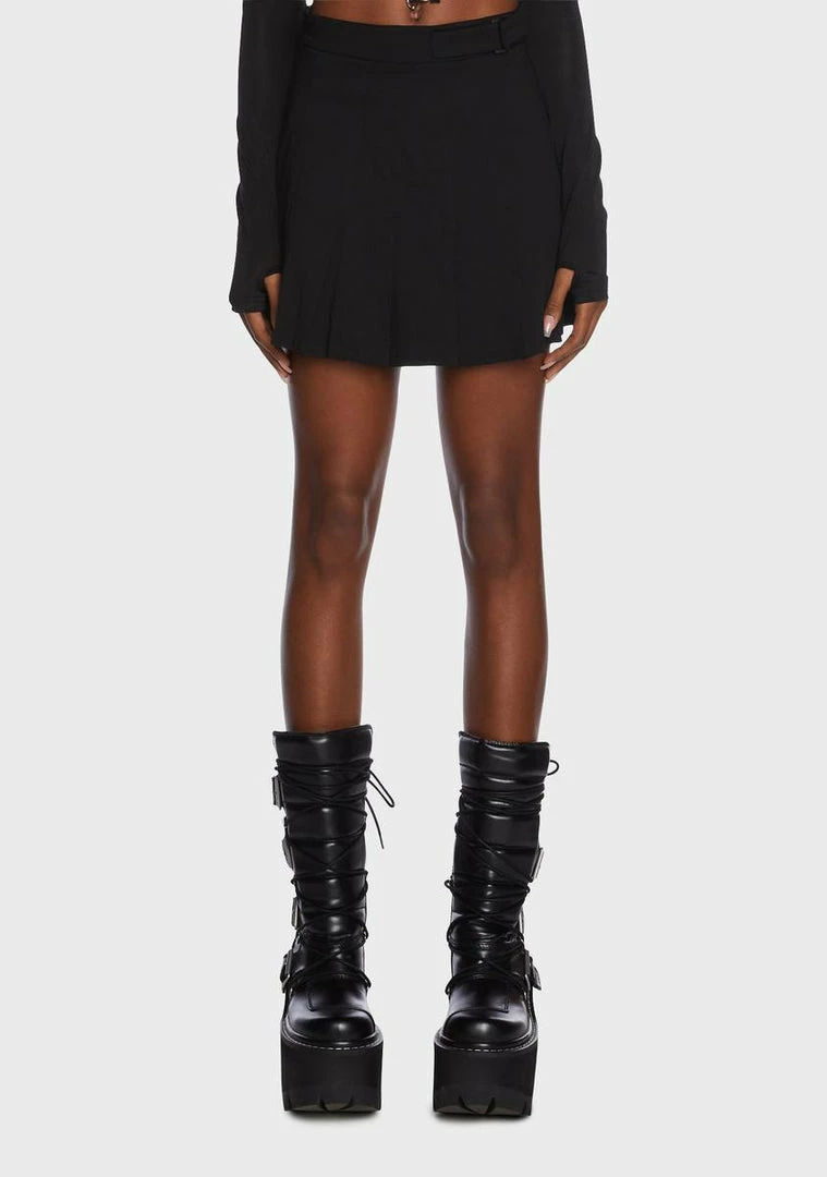 cuz you’re takin’ namez, babe. This pleated mini skirt has a high waist fit, an adjustable belt design, and a side zip closure.