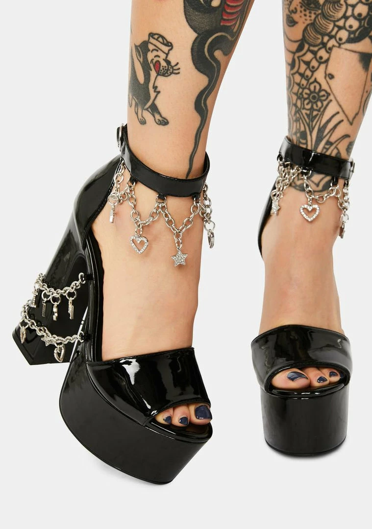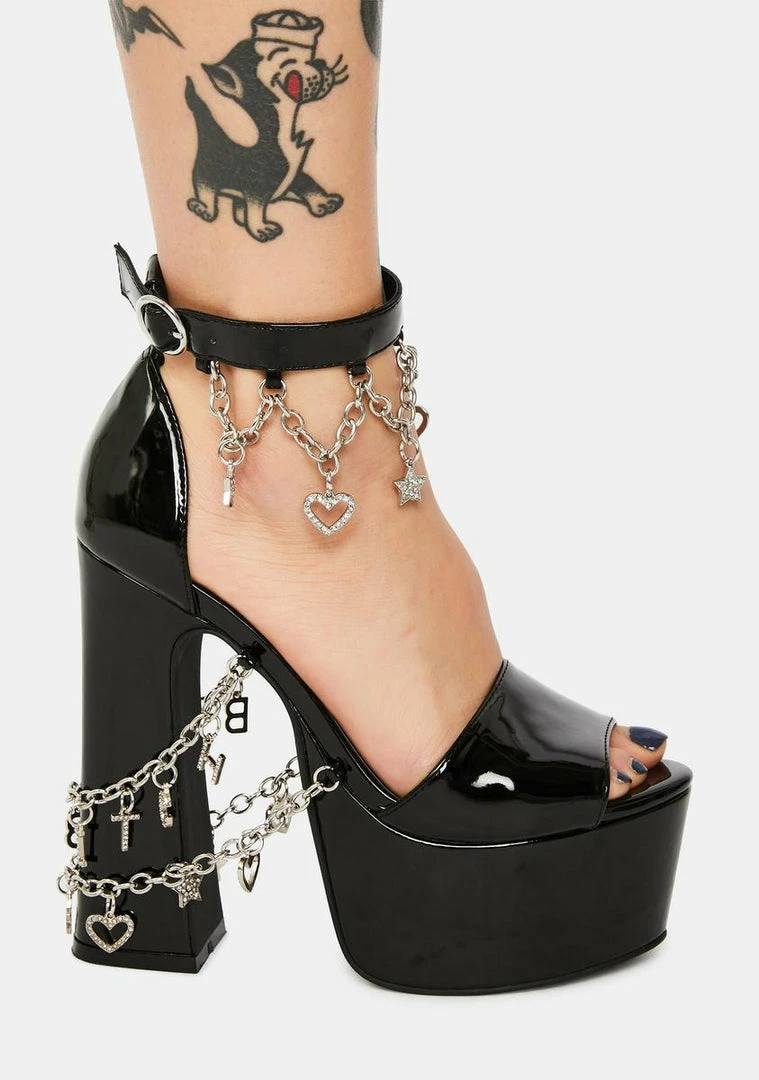 cuz ur the hottest gossip in town. These platform sandals have a faux leather construction, buckle close ankle strap, open toe design, and chain details all over with rhinestone letter, heart and star charms.