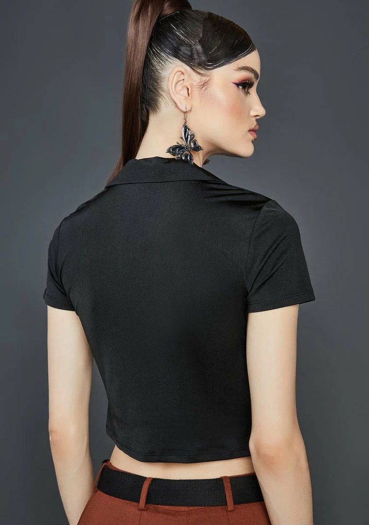 cuz you bring out the worst in me. This crop top comes with a collared neckline, short sleeves, and button up closures.