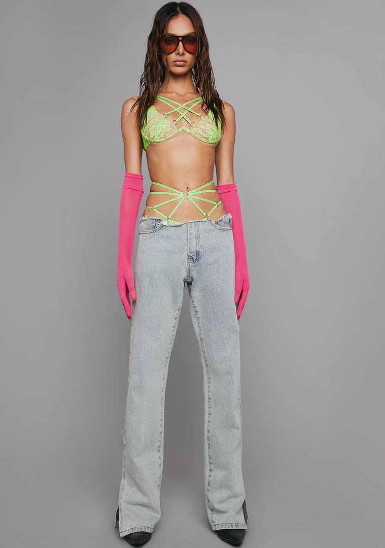 cuz you’ve got them head over heels! This sexy lingerie set has a neon lace construction, strappy details with O-ring hardware, and an underwire bust.