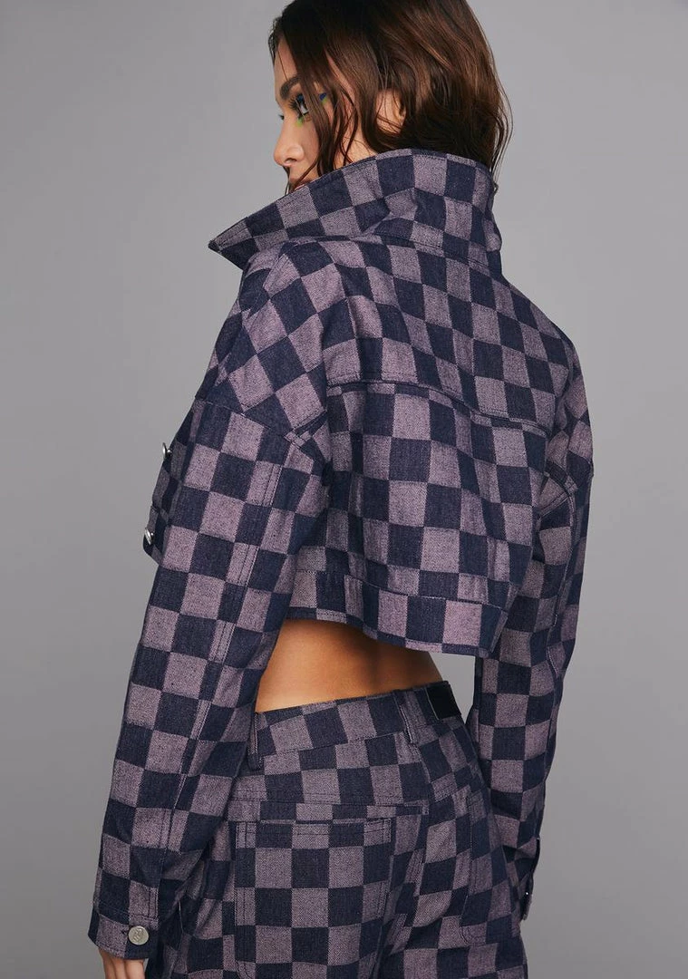 cuz you only chase shots and dreams! This boxy trucker jacket has a denim construction with a checkered print all over, a cropped fit, and logo button closures on the front.