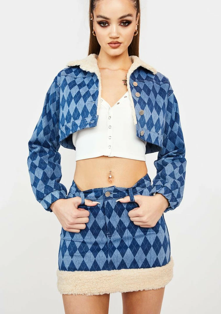 luck be a lady! This denim mini skirt has an argyle print all over, a high waist fit, and sherpa faux fur trim.