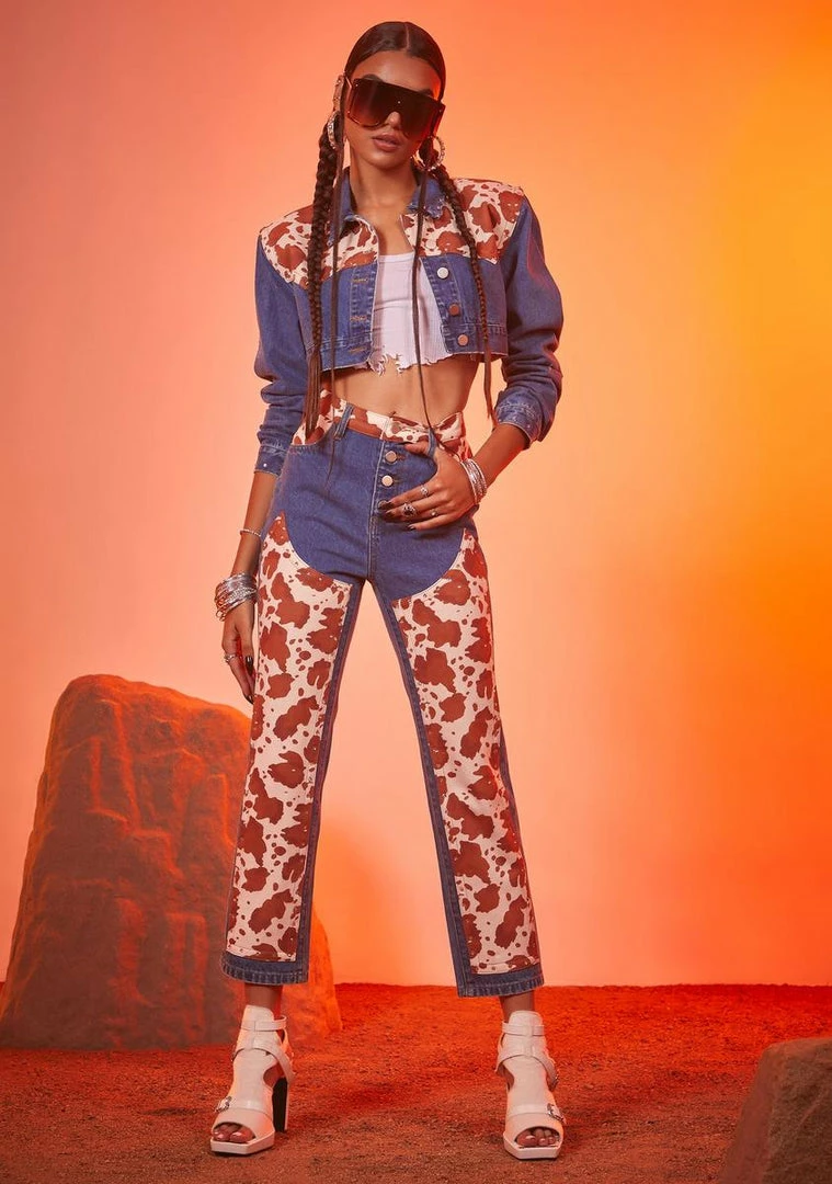 cuz you keep it feisty. These high waisted crop jeans have cow print panels, pockets on the back, and exposed front button closures.