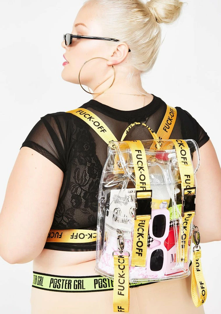when you wanna say it loud Nâ clear. This dope PVC clear mini backpack has a drawstring closure and yellow straps with silver buckle details that say âFUCK-OFFâ.