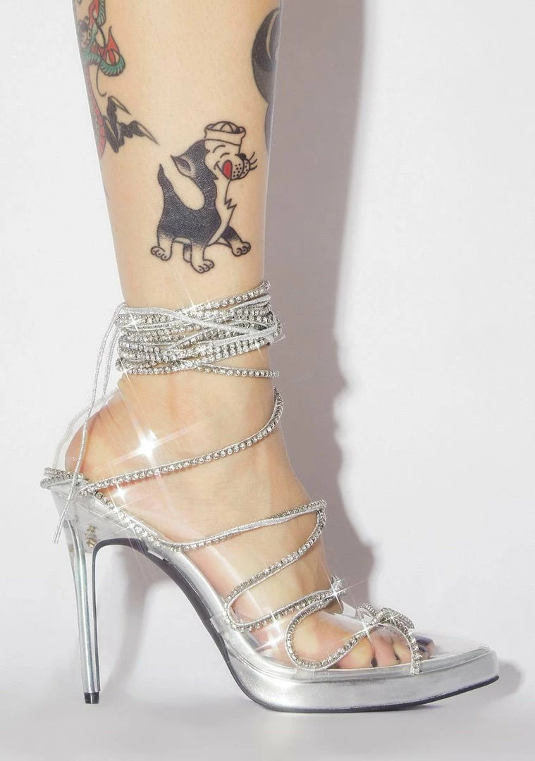 cuz it ainât your fault that youâre out here makinâ movez! Yer not just a snack, youâre the whole damn meal in these glitzy wrap heels that have long rhinestone lace-up strands, a clear PVC construction, pointed toes Nâ sexy stiletto heels.