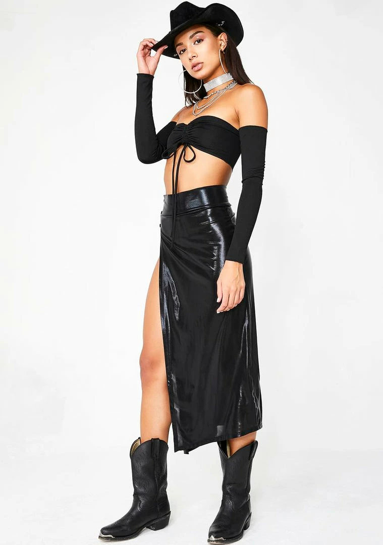 itâs not too much drama but DRAMA. Pull up in this icy hott semi-sheer midi skirt that has lavish lil side straps, a sassy flowinâ fit, Nâ a supa high slit to have âem risk it all.
