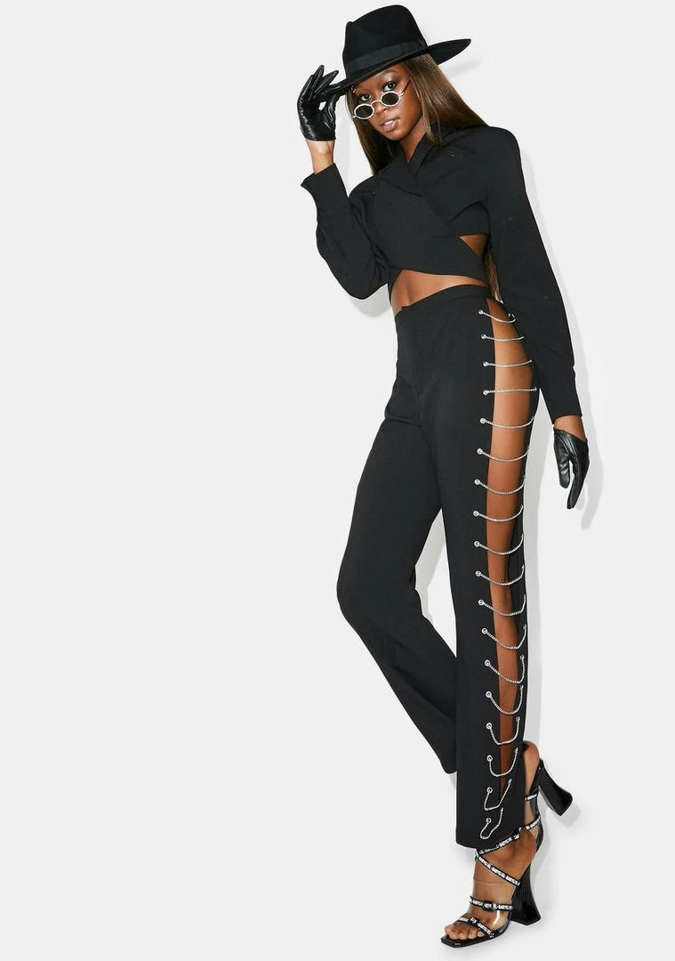fer securing tha bag sis! Get down to bizness in these chic AF high waisted trouser pants with a straight leg fit and side cut-outs that have chains goin all the way up the leg.
