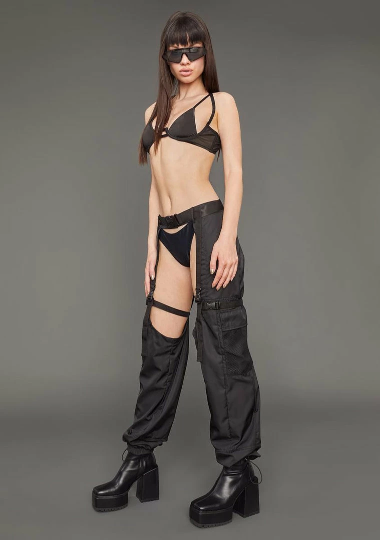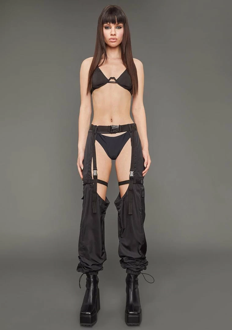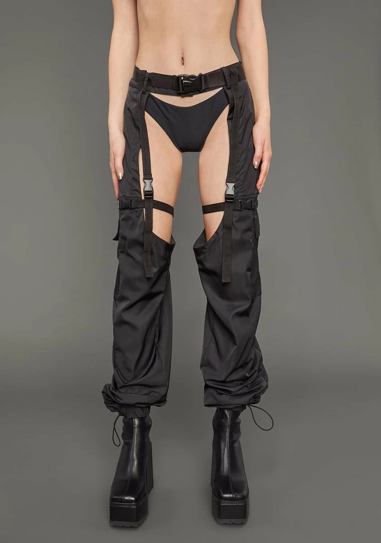 donât be shy now, babe. These parachute cargo chaps have strappy buckle details, pockets on the sides, and adjustable toggle cord cuffs.