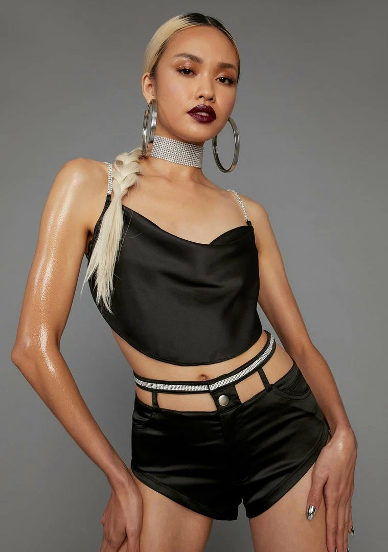 cuz sometimes all you need is a little sparkle. These shorts have a cutout design and rhinestones along the waistband with a button closure.