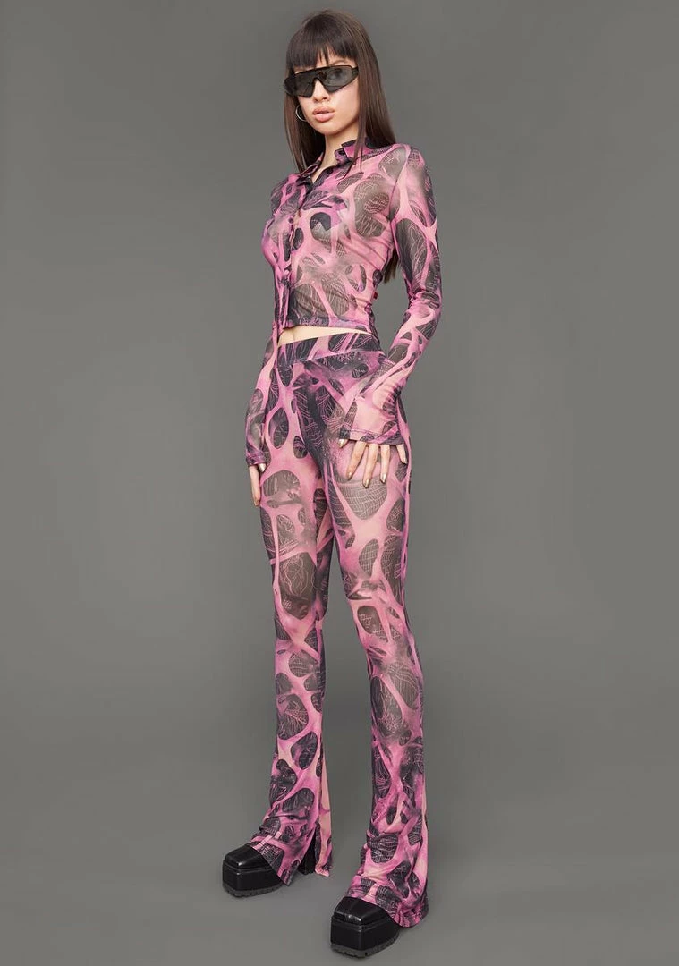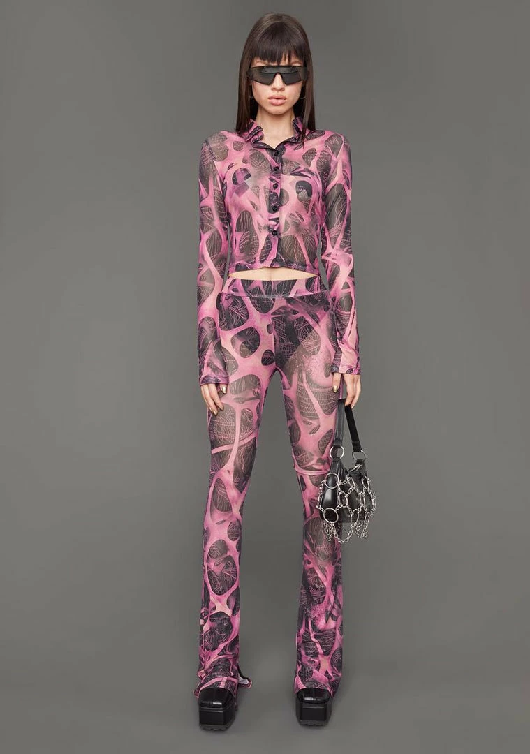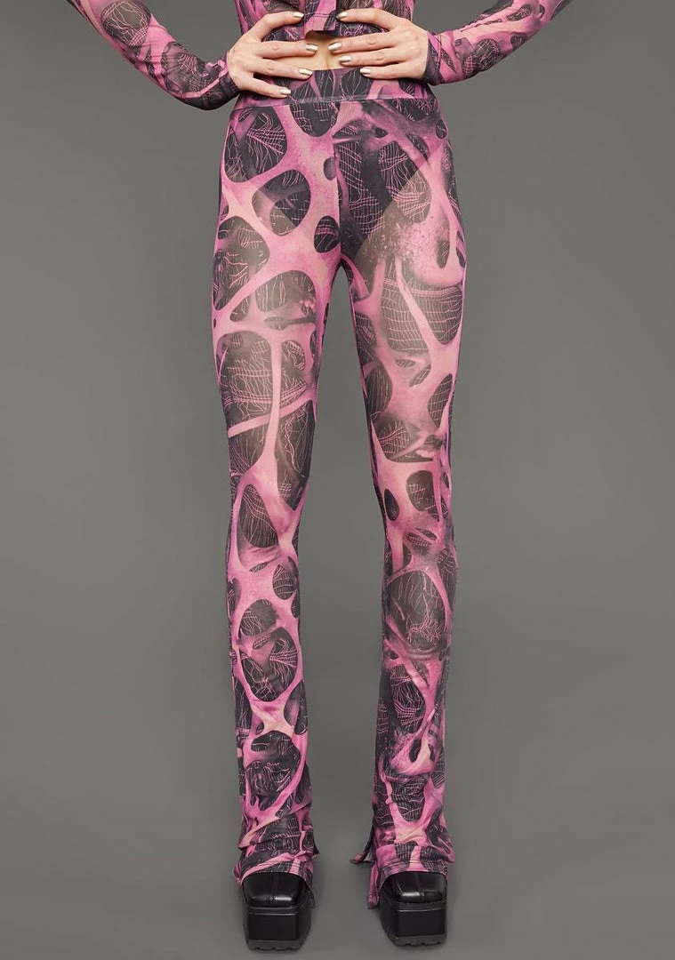 cuz they know you hustle hard. These mesh bootcut pants have a high waist fit, skinny legs and a microscopic print all over.