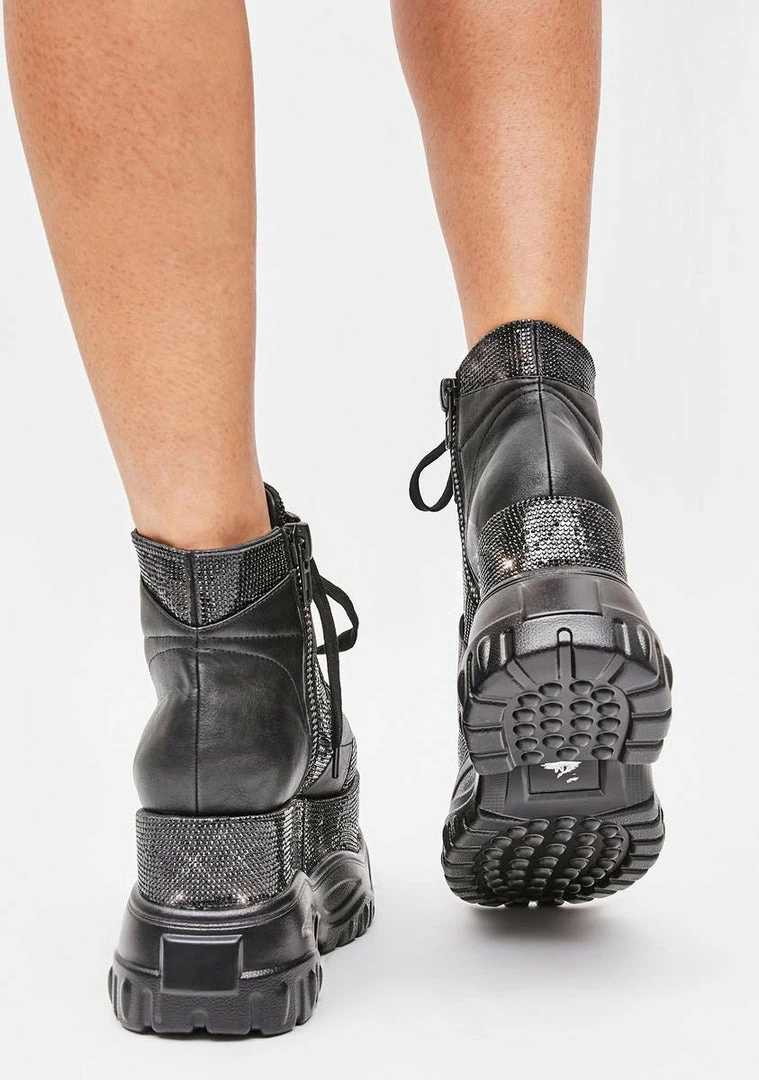 cuz youâre a hype queen. These super stacked chunky platform sneakers have black rhinestone embellishments, side zip closures, and adjustable laces.