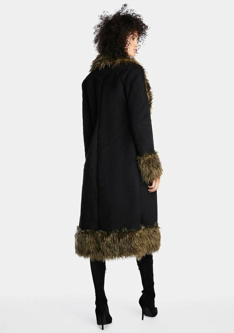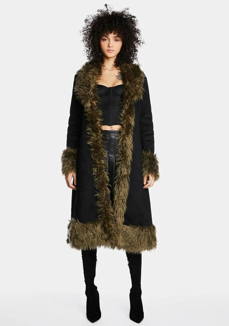 who cares what anyone else thinks? This midi-length jacket has a faux suede construction, faux fur trim, cozy fleece lining, long sleeves, side pockets, and a hook-and-eye closure at front.