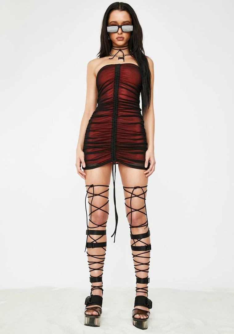or donât bother trying, boo! Your confidence is intoxxxicating in this ultra hot mini strapless dress that has a sheer mesh overlay, bust grip lining and a sexy AF center seam ruched design with adjustable ties.