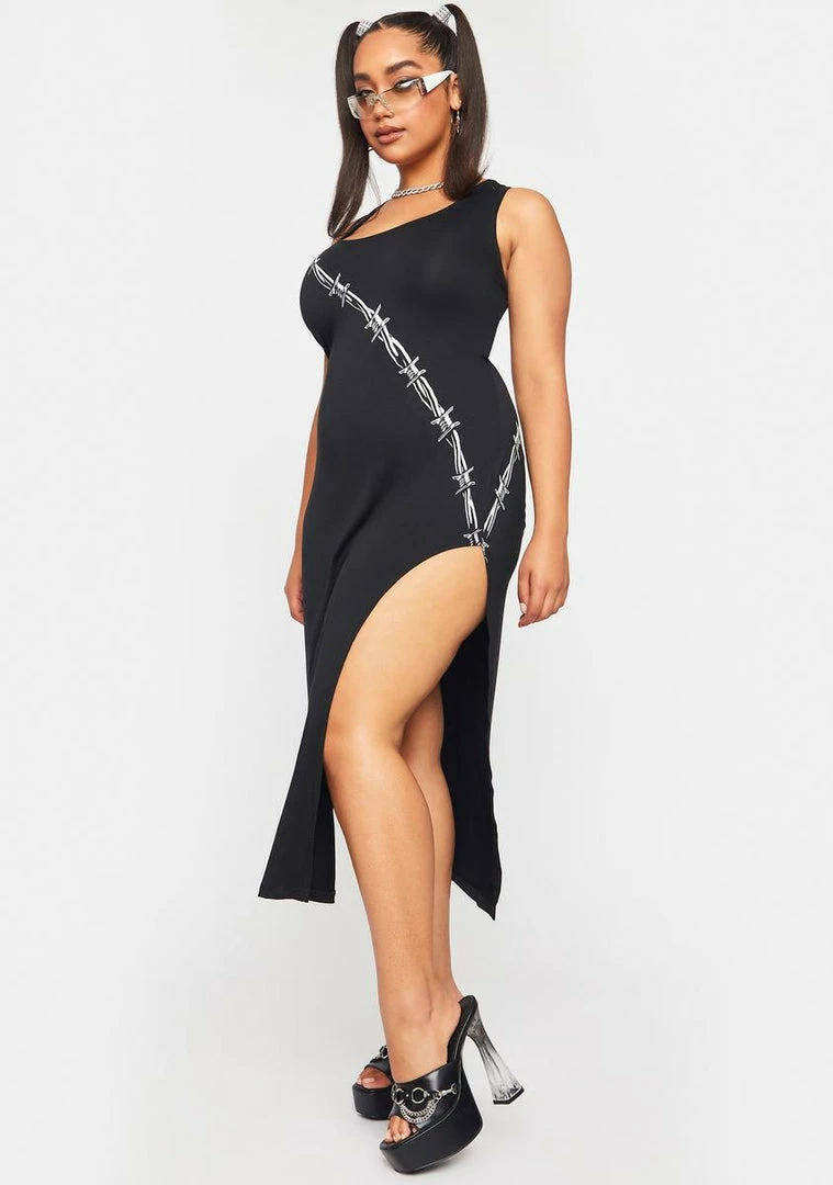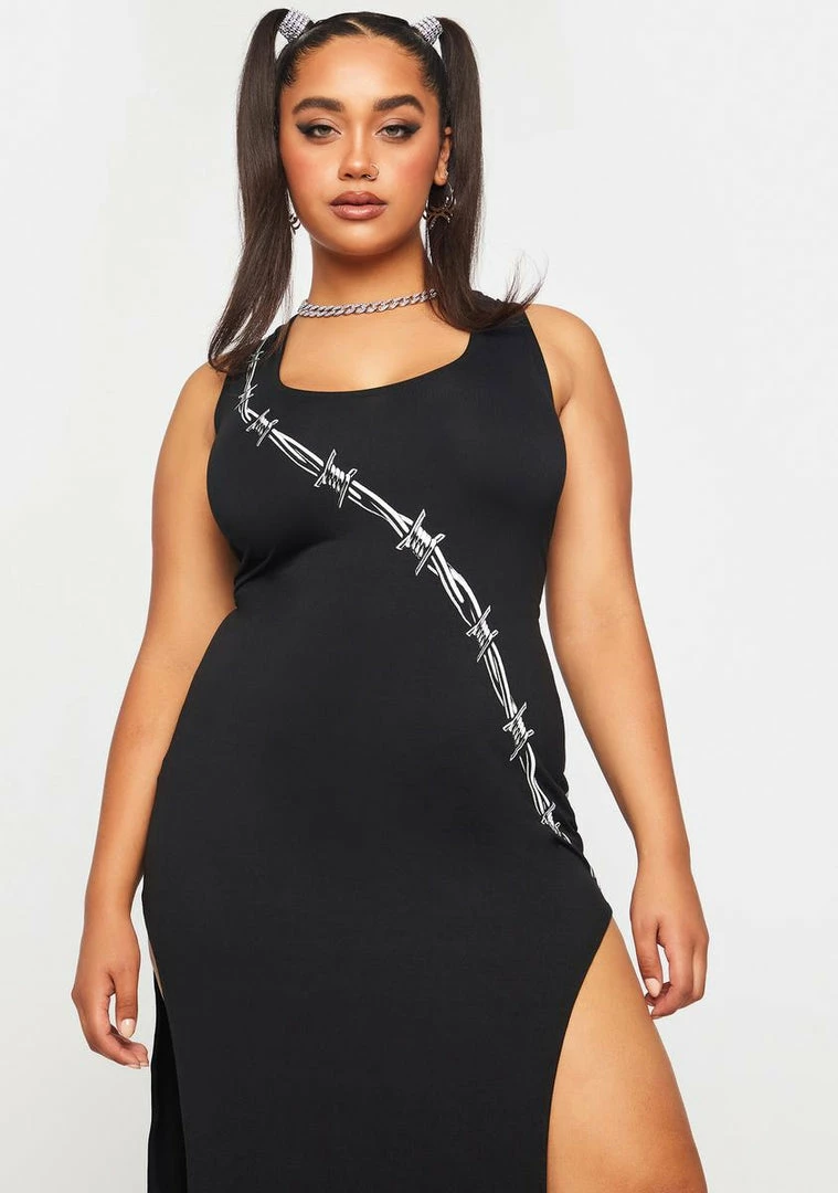 but you wanna guard your heart. This tank maxi dress has high leg slits, a scoop neckline, and barbed wire prints on the front and back.