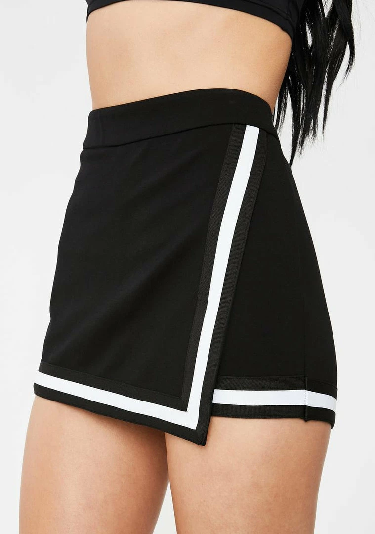 donât hate me cuz Iâm beautiful! Hate me cuz you ainât me in this bodied high waist mini skort that has a supa stretchy waistband, contrast stripe trim, back O-ring zip closure Nâ front wrap construction.