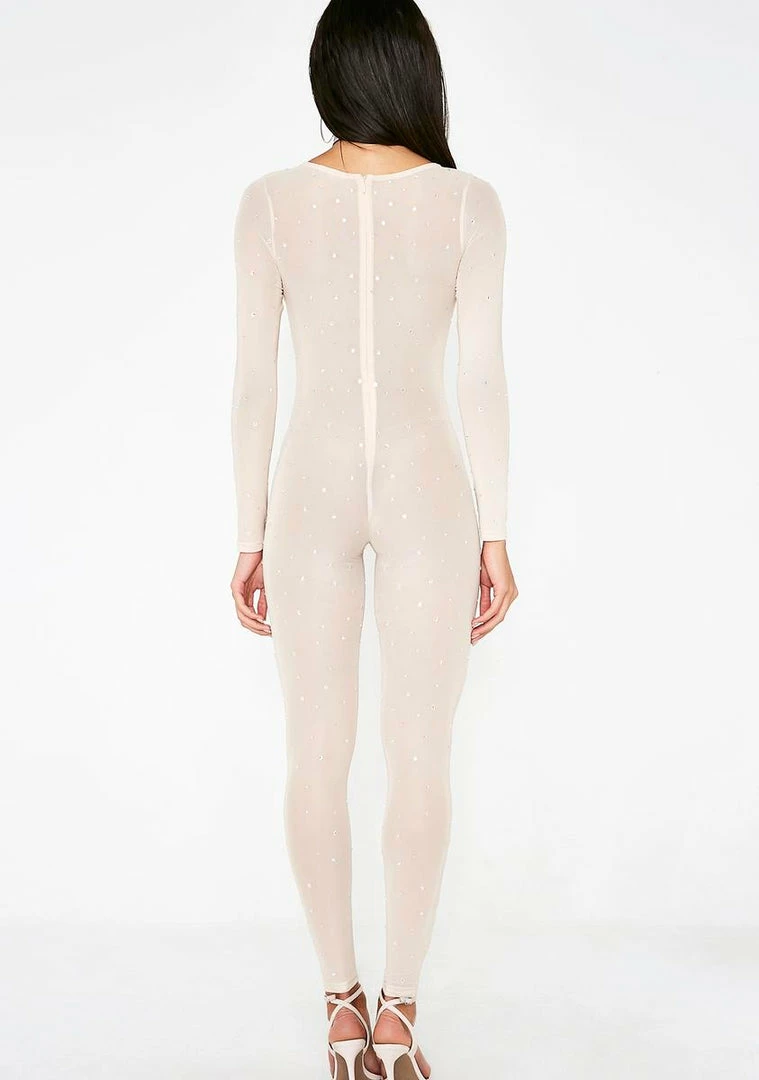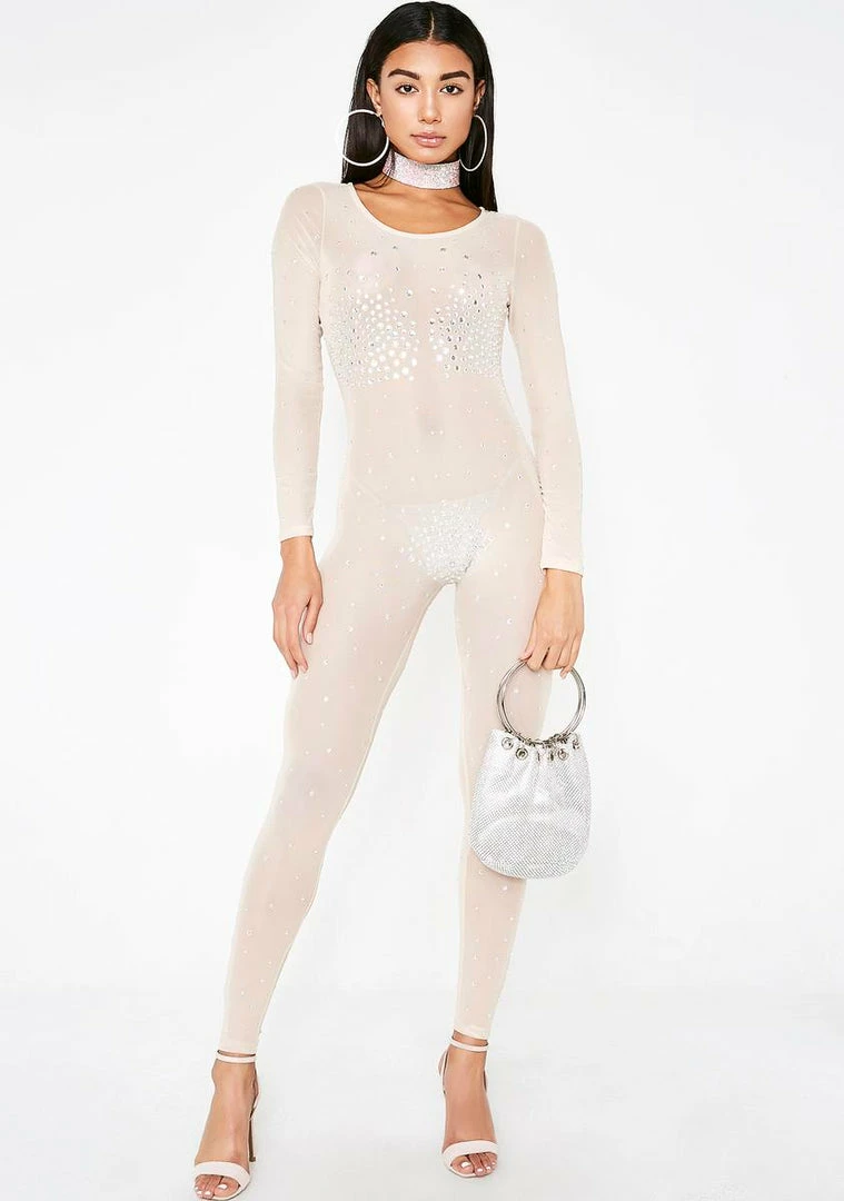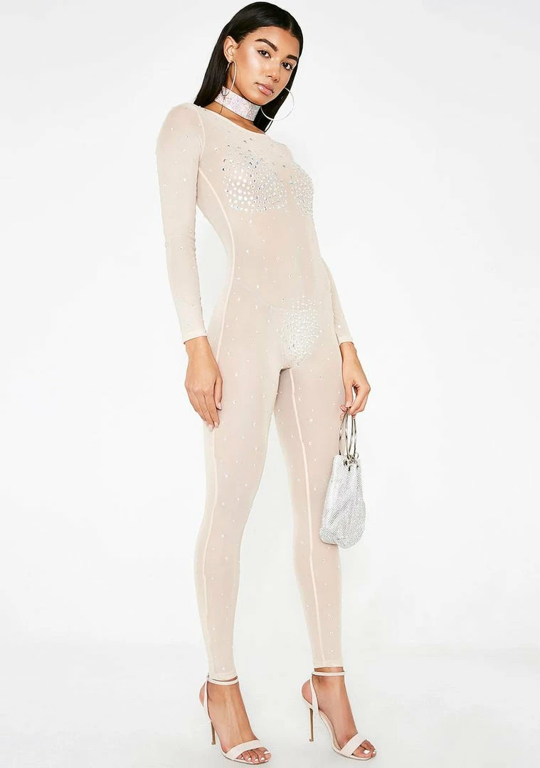 cuz you have a taste for luxury and luxury has a taste for you bb. Show it all off in this dazzling sheer mesh catsuit that has iridescent crystals on the front, long sleeves and a back zip closure.