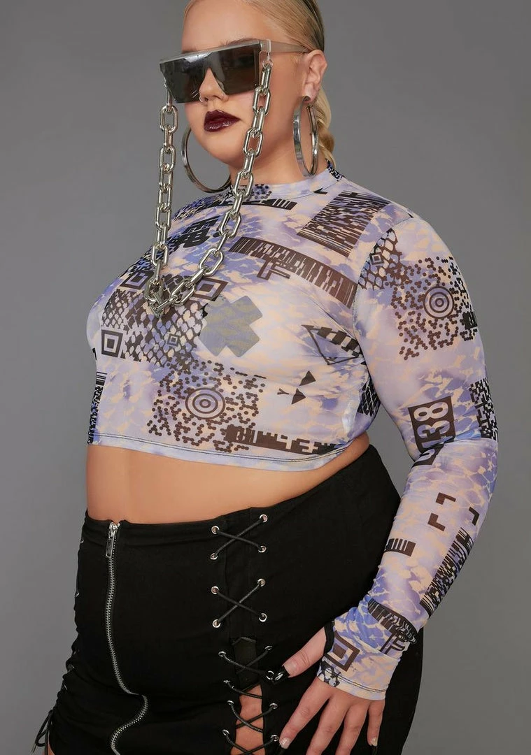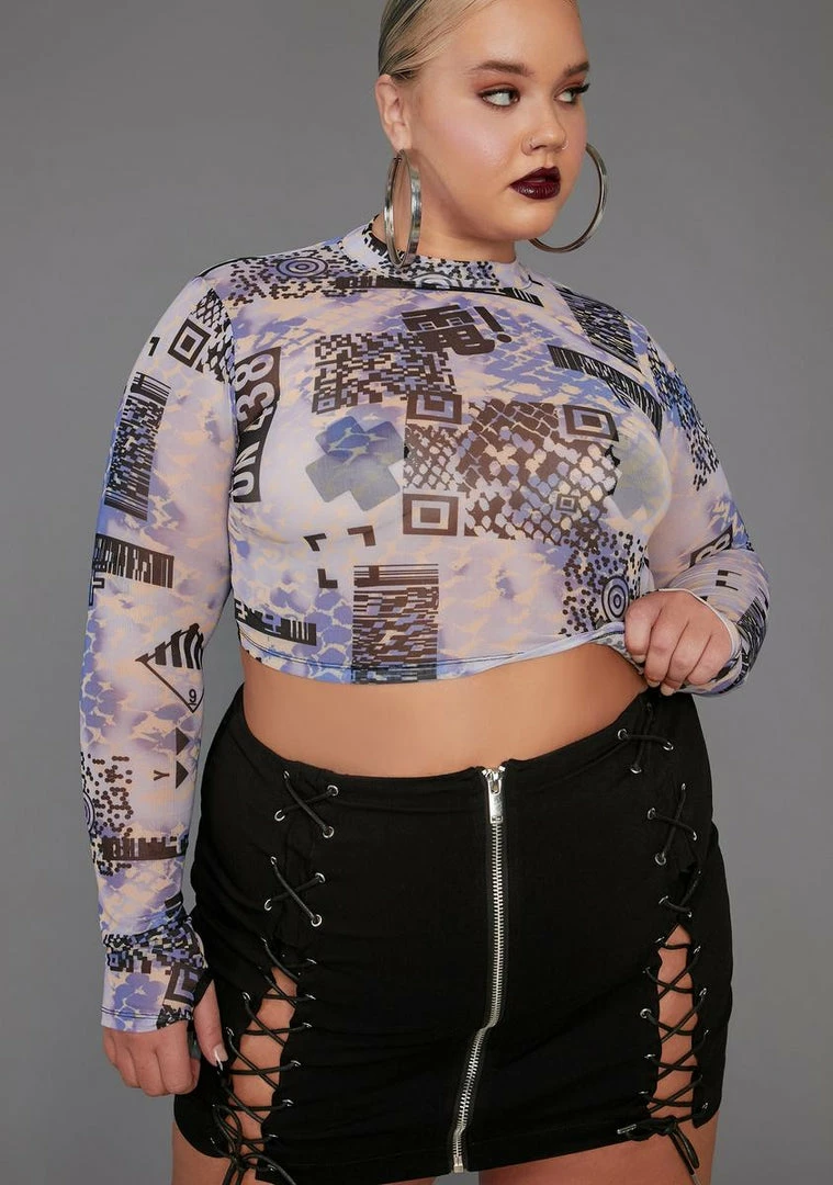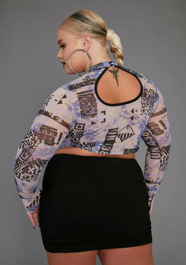issa digital love story, babe. Download your destiny in this mesh crop top that has a mock neckline, long sleeves with thumbholes, and a mixed qr code, bar code, and snakeskin print all over.