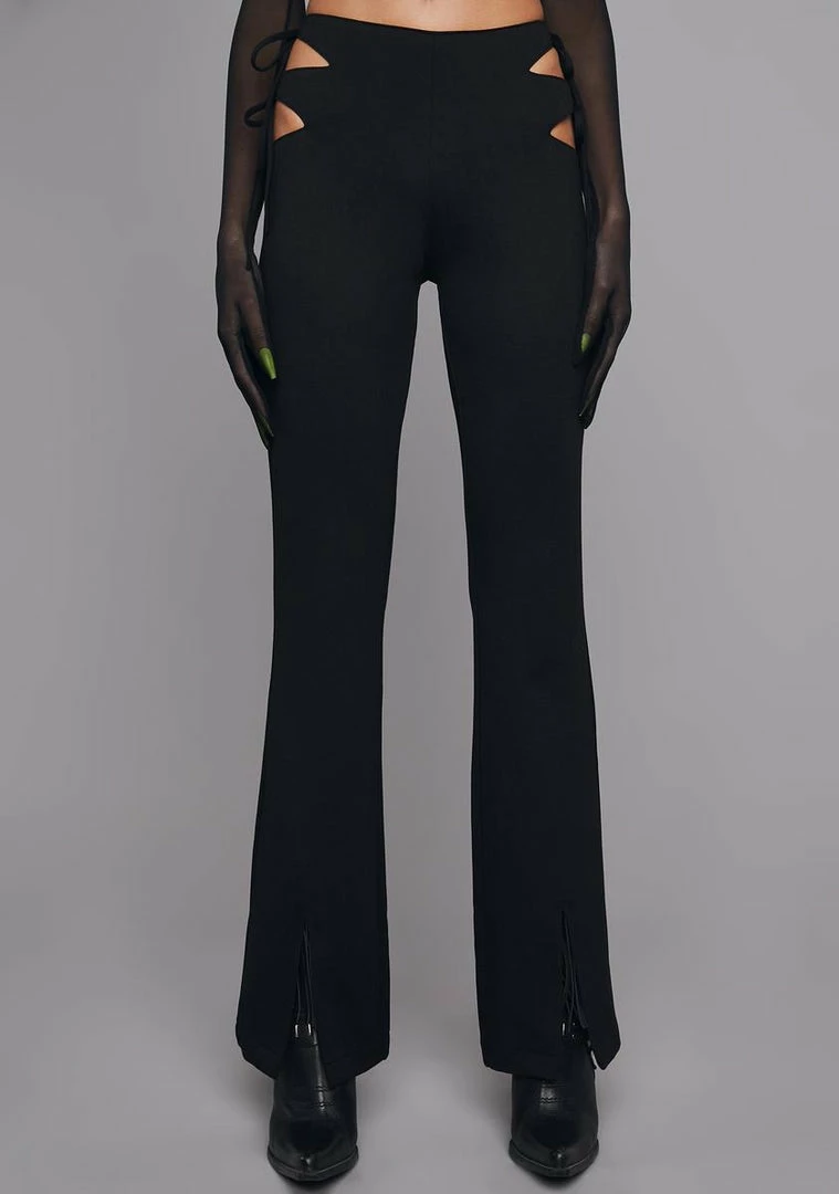 check my temp. These pants come in a flared construction, with a high waist, slits, and waist side cut outs with tie closures.
