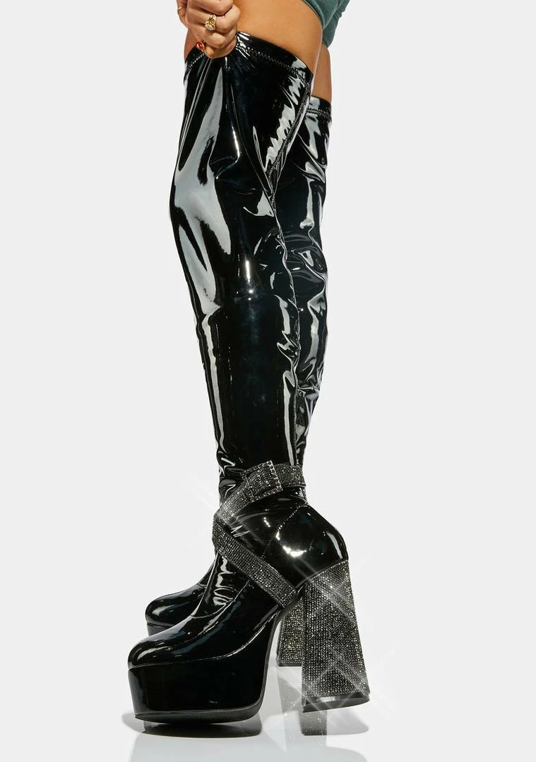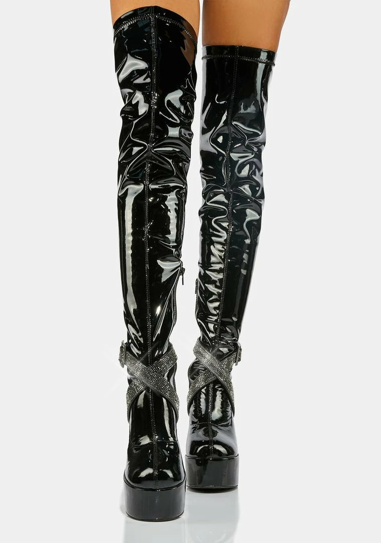 cuz you need to sparkle wherever you go. These thigh high boots have a vegan patent leather construction,a rhinestone encrusted criss cross design and heels, and adjustable buckle closures.