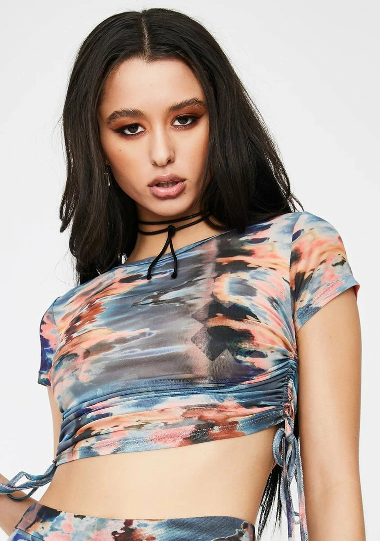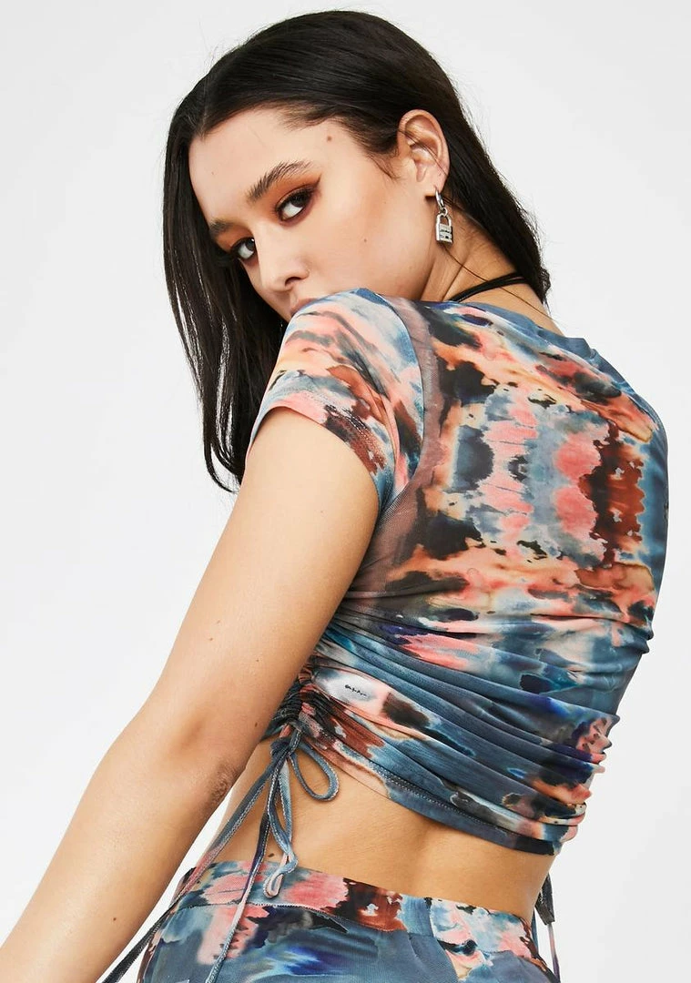 will have ya lookinâ down on the basic betches! You need all the leg room while you sip your champagne in this short sleeve crop top that has a supa stretchy Nâ sheer mesh material, sikk tie dye watercolor print all ova and ruched ties on the side.