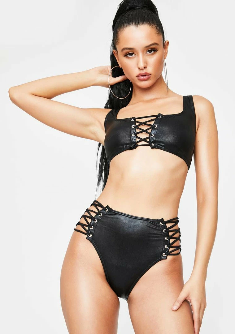 you rang? Today only, issa two for one special with ya showinâ up in this two piece set that has a square neck top Nâ cheeky bottoms that have a faux leather construction and lace up details with silver grommet hardware.