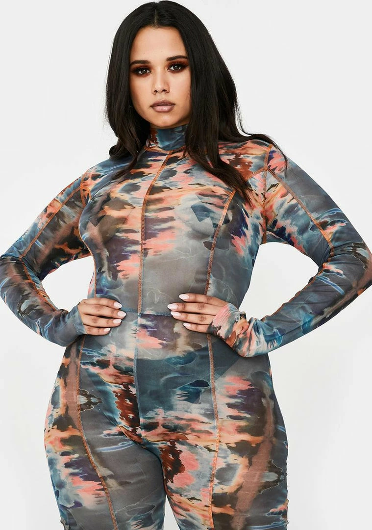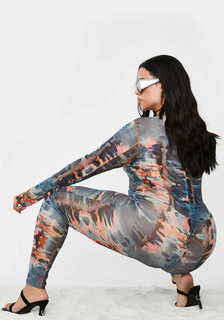will have ya lookinâ down on the basic betches! You need all the leg room while you sip your champagne in this long sleeve catsuit that has a supa stretchy Nâ sheer mesh material, sikk tie dye watercolor print all ova, contrast stitching and a back zip closure.