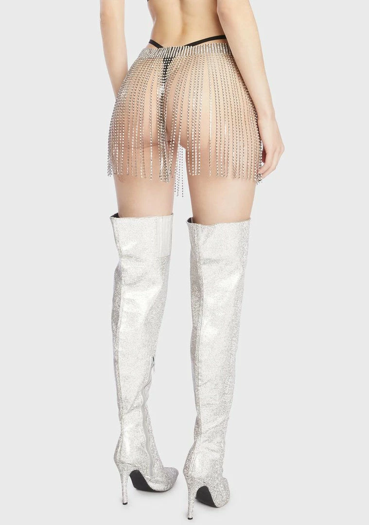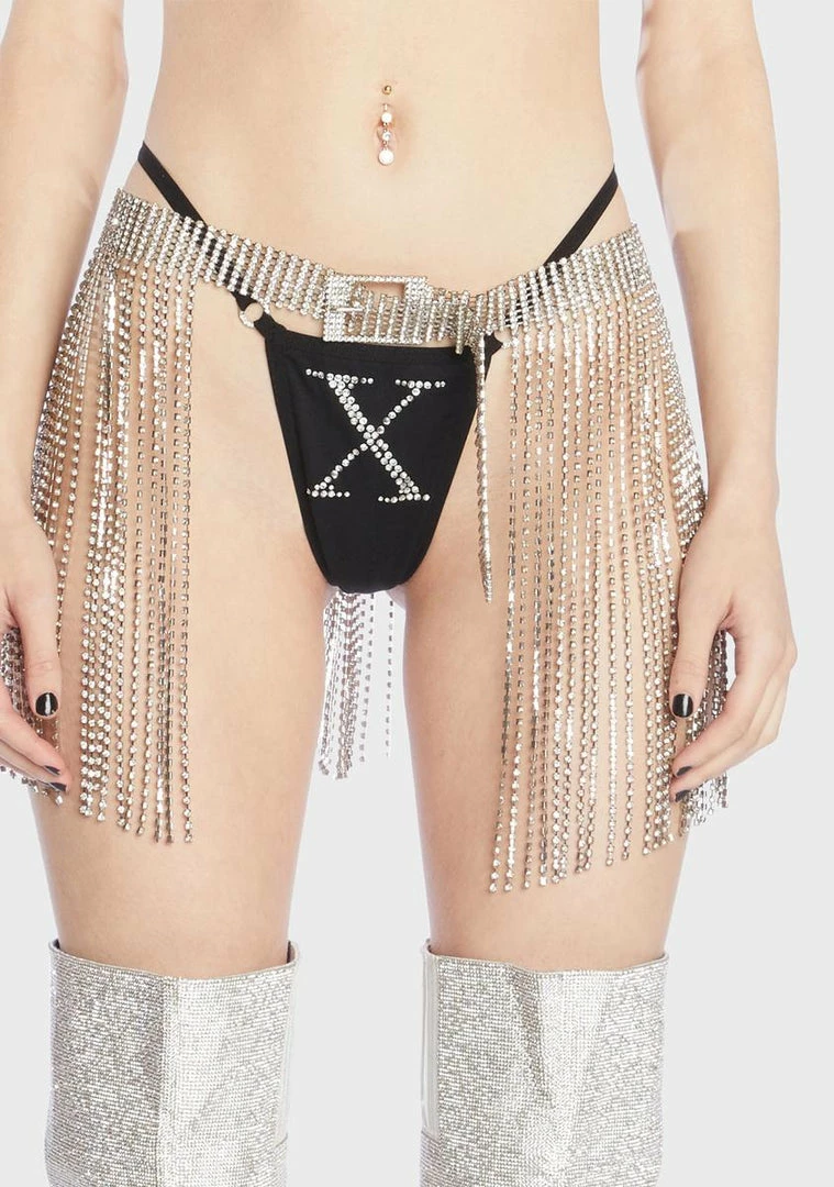 cuz we’ve been here before. This belt comes in a rhinestone construction, with fringe details, and a buckle closure.