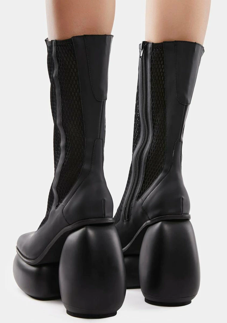 you don’t have to see it to believe it. These mid-calf boots have a vegan leather construction, sporty fishnet panels, chunky molded platforms and heels, side zip closures, and square toes.