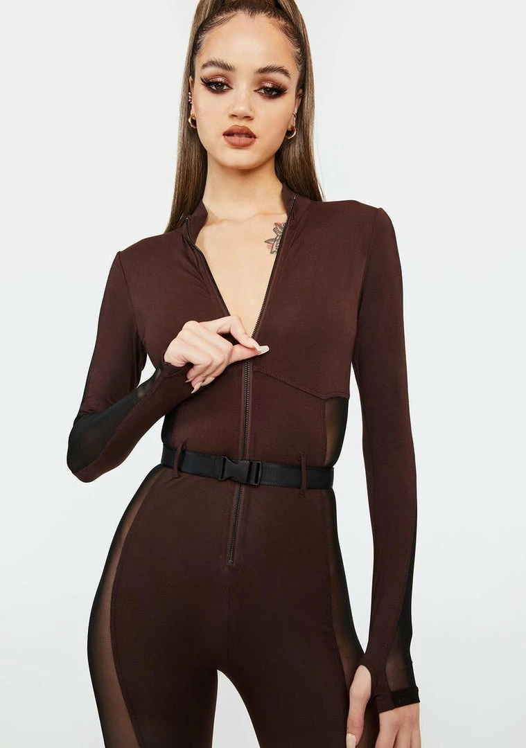 youâve got your bachelorsâ in bossy. This jumpsuit has mesh paneling at the sides of the body and arms, long sleeves with thumb holes, a zipper up the front, a lil collar, and a canvas belt at the waist.